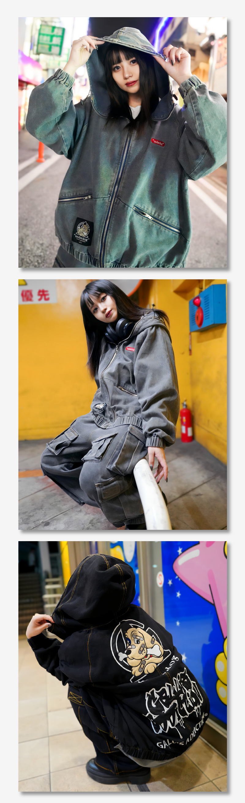 GALFYとGALLIS ADDICTIONのコラボレーションによって誕生した、存在感抜群の別注デニムフードジャケット。 フロントにはブランドロゴ刺繍を施し、背面には大胆なグラフィックアートを配置することで、視線を惹きつけるデザインに仕上げました。ゆったりとしたシルエットはストリートスタイルに最適で、レイヤードにも対応。 単品使いでも十分なインパクトを放ちますが、同シリーズのカーゴパンツとセットアップで着用することで、より統一感のあるスタイリングが完成します。