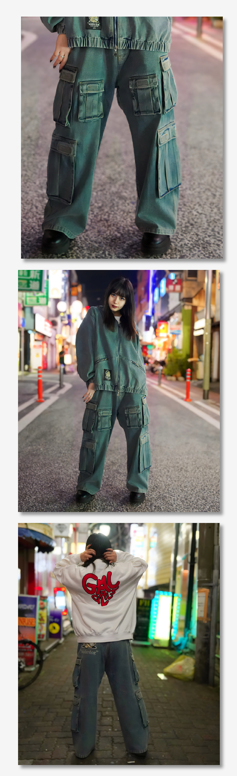 ストリートと機能性を融合させた、GALFY×GALLIS ADDICTIONの別注デニムカーゴパンツ。 複数のポケットを備えた実用的なディテールと、程よくルーズなシルエットが特徴です。動きやすさとスタイルを両立し、日常使いからアクティブなシーンまで幅広く対応。 単品でもコーディネートの主役として活躍しますが、同シリーズのフードジャケットとセットアップで着用することで、ブランドの世界観をより深く体現できます。