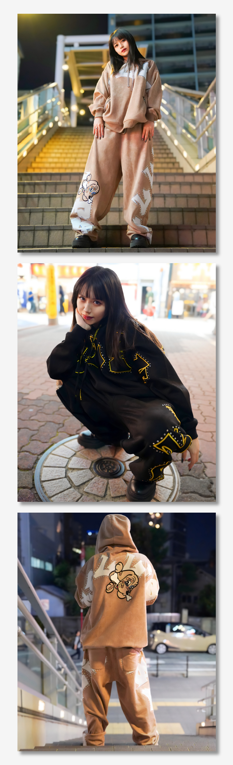 ストリートに煌めきを添えるGALFY×GALLIS ADDICTIONの「スウェードキラキラ SETUP」。 スウェード調の素材に鮮やかなステッチとキャッチーなグラフィックを組み合わせ、遊び心と存在感を兼ね備えたデザインに仕上げました。フーディの背面にはブランドの象徴とも言えるキャラクターが大胆に描かれ、パンツにも統一感のあるグラフィックが施されています。 セットアップでの着用はもちろん、単品使いでもコーディネートの主役として活躍。都会的なムードとユーモアを融合させた、唯一無二の一着です。