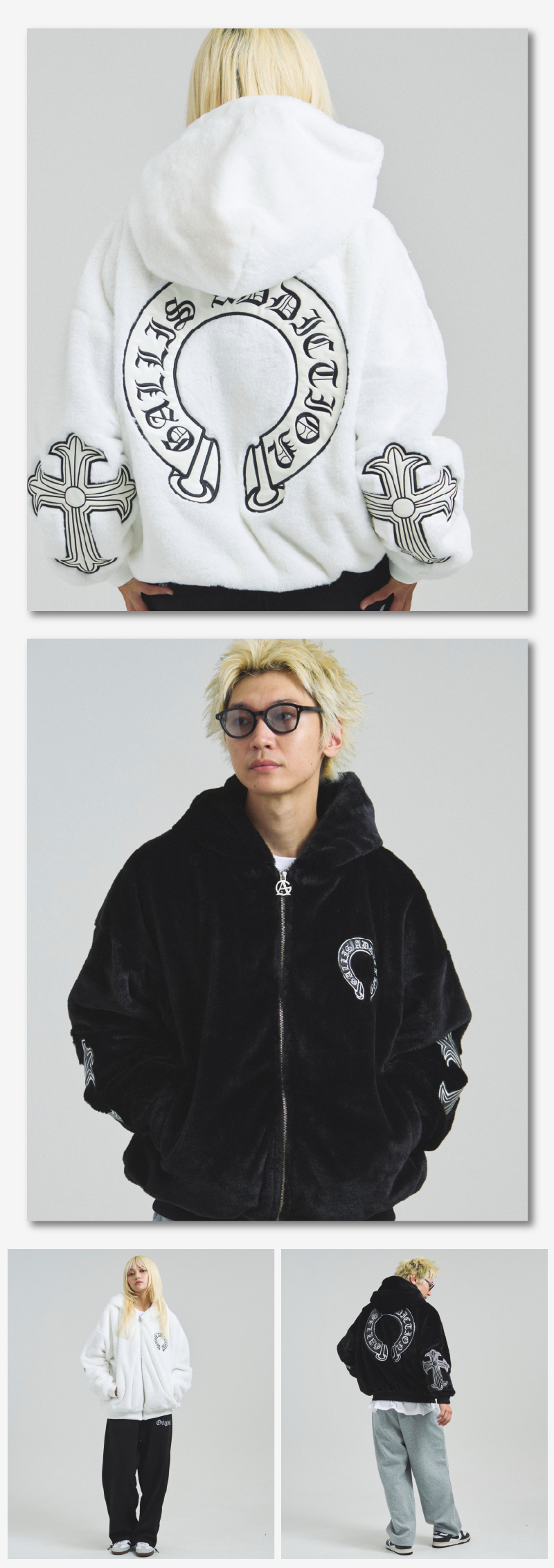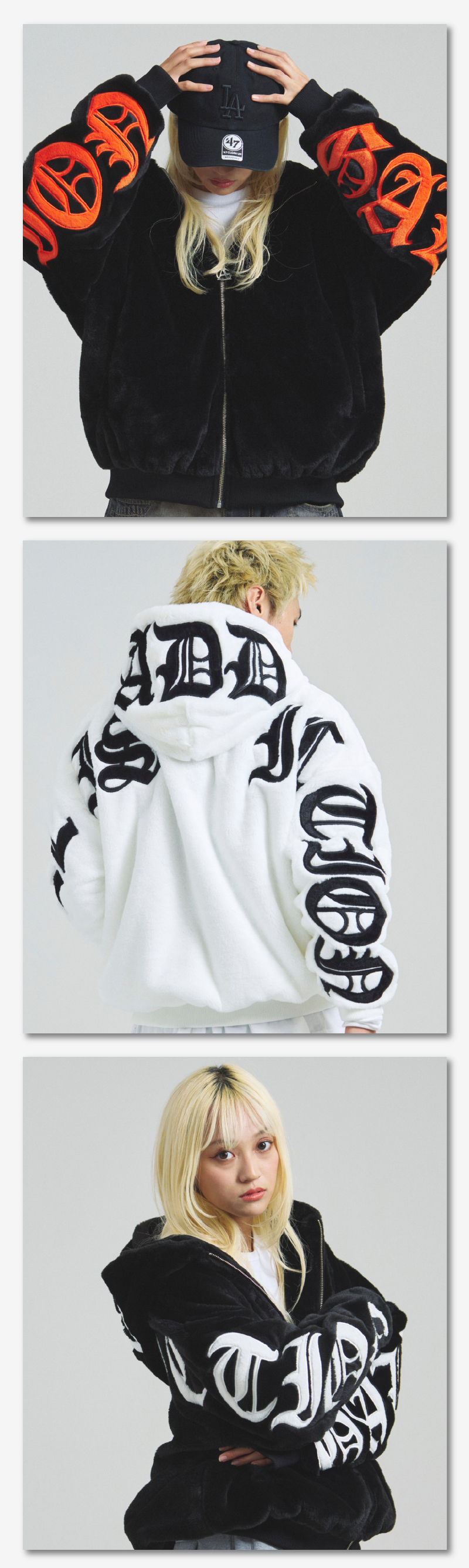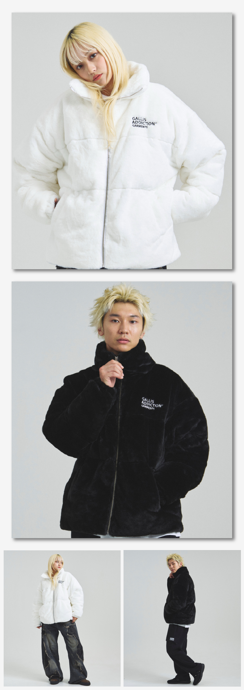 毛足の長いフェイクファー素材を贅沢に使用し、ふんわりとした肌触りと高い保温性を両立。軽量で柔らかな着心地が魅力で、ストリートからデイリーまで幅広いスタイリングに対応します。