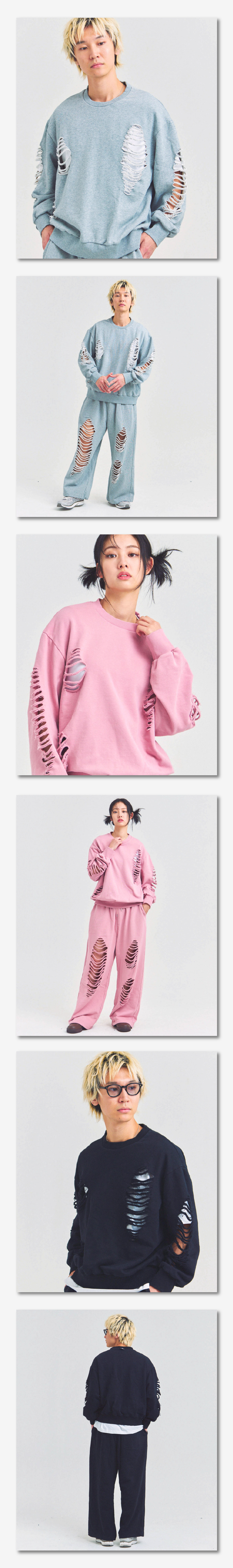 大胆なダメージ加工が際立つ、GALLIS ADDICTIONのクルーネックスウェットとスウェットパンツによるセットアップ。