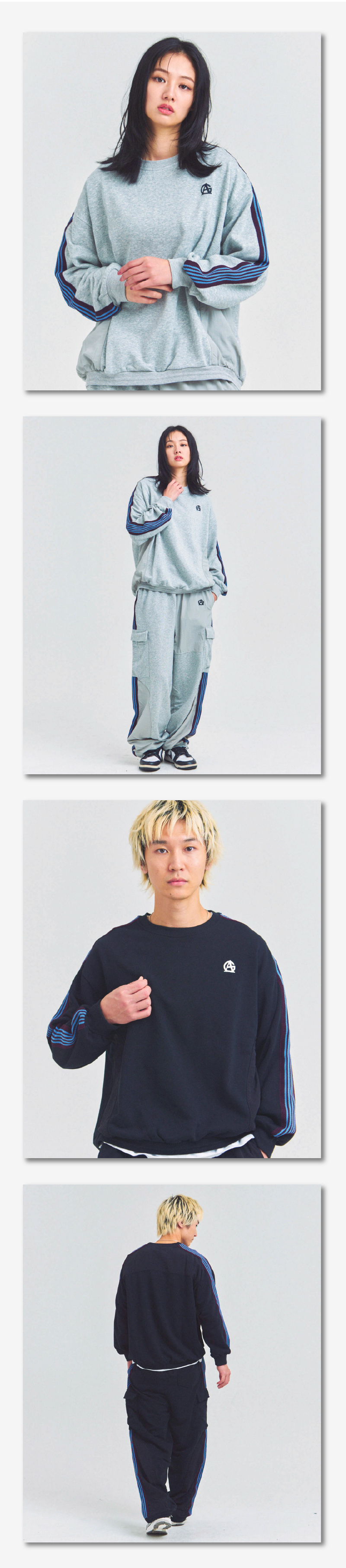 落ち着いたトーンのグレーとブラックを基調に、都会的で洗練されたストリートスタイルを演出。トップスは程よくゆとりのあるシルエットで、1枚着はもちろんレイヤードにも対応し、秋冬のデイリーユースに活躍。ボトムスはワイドすぎない絶妙なシルエットで、リラックス感と動きやすさを両立しています。左胸・左腿にはそれぞれGAブランドロゴ刺繍を施し、統一感のある仕上がりに。