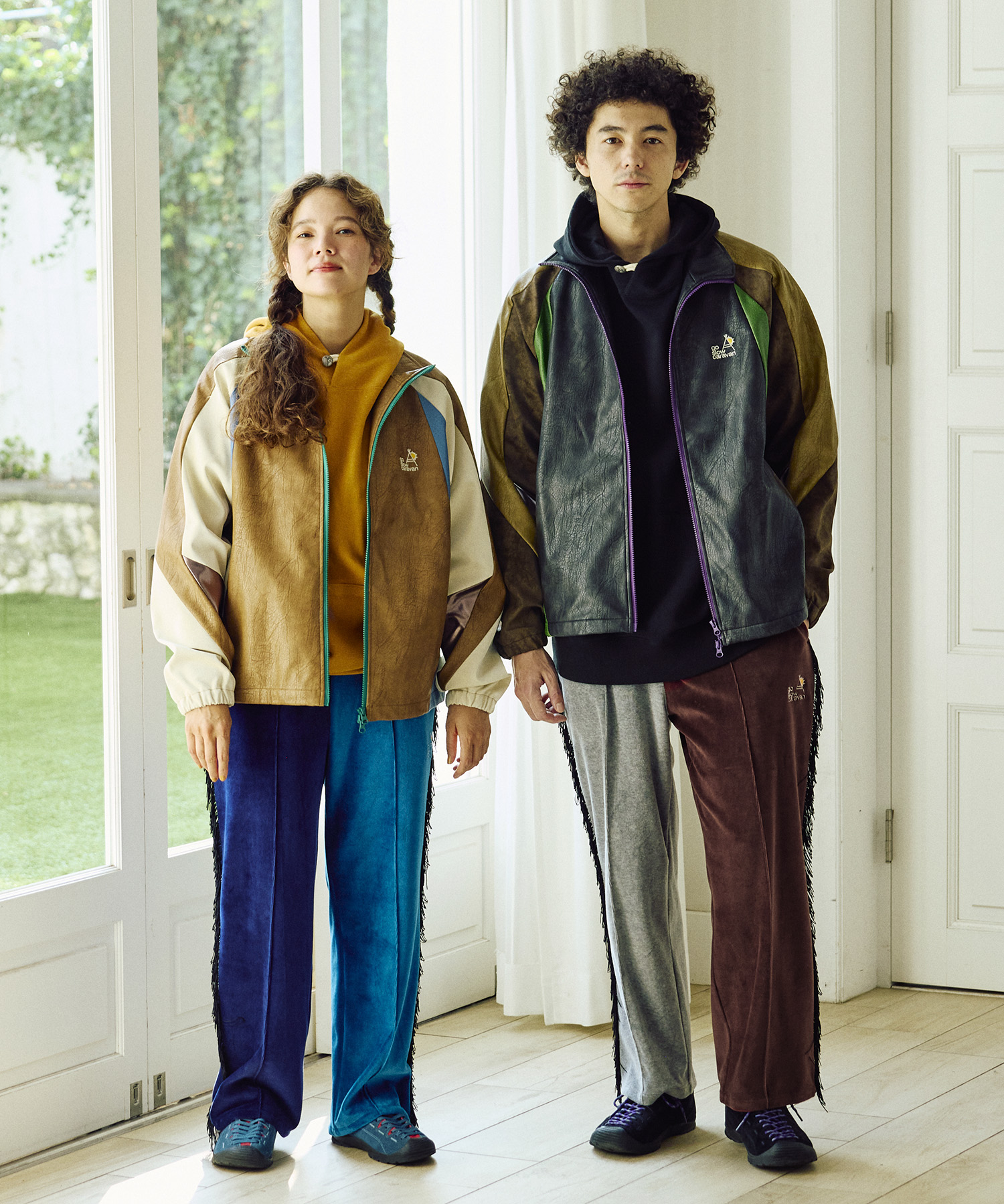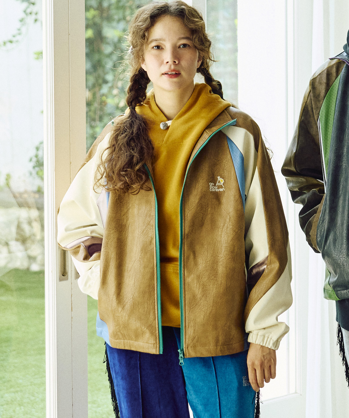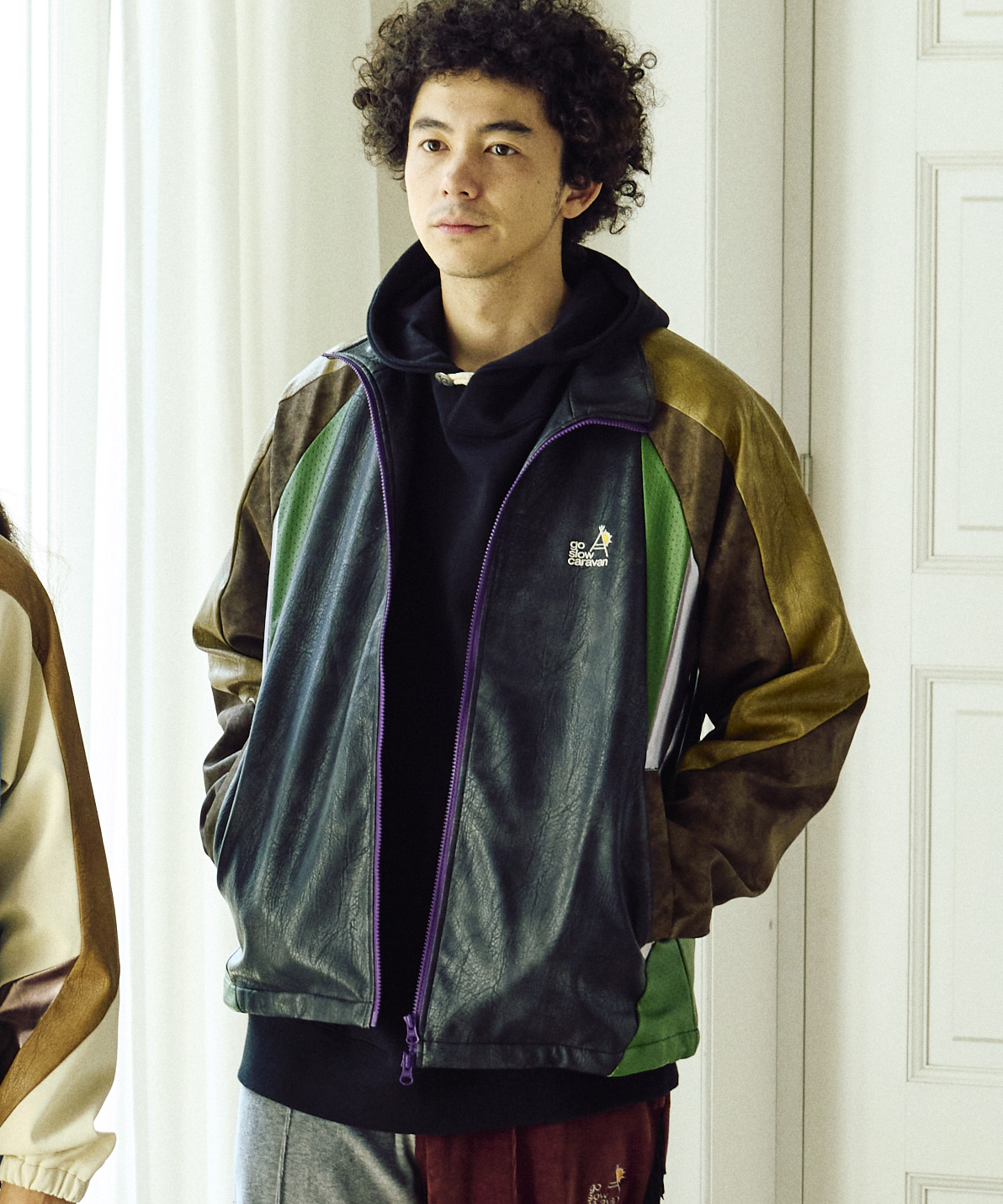 表情の異なる数種類のフェイクレザーを組み合わせたブルゾンが登場。トラックジャケットなどスポーツウェアのような切り替えを取り入れることにより一癖あるアウターに。ゆったりとしたサイズ感で裏地付き。