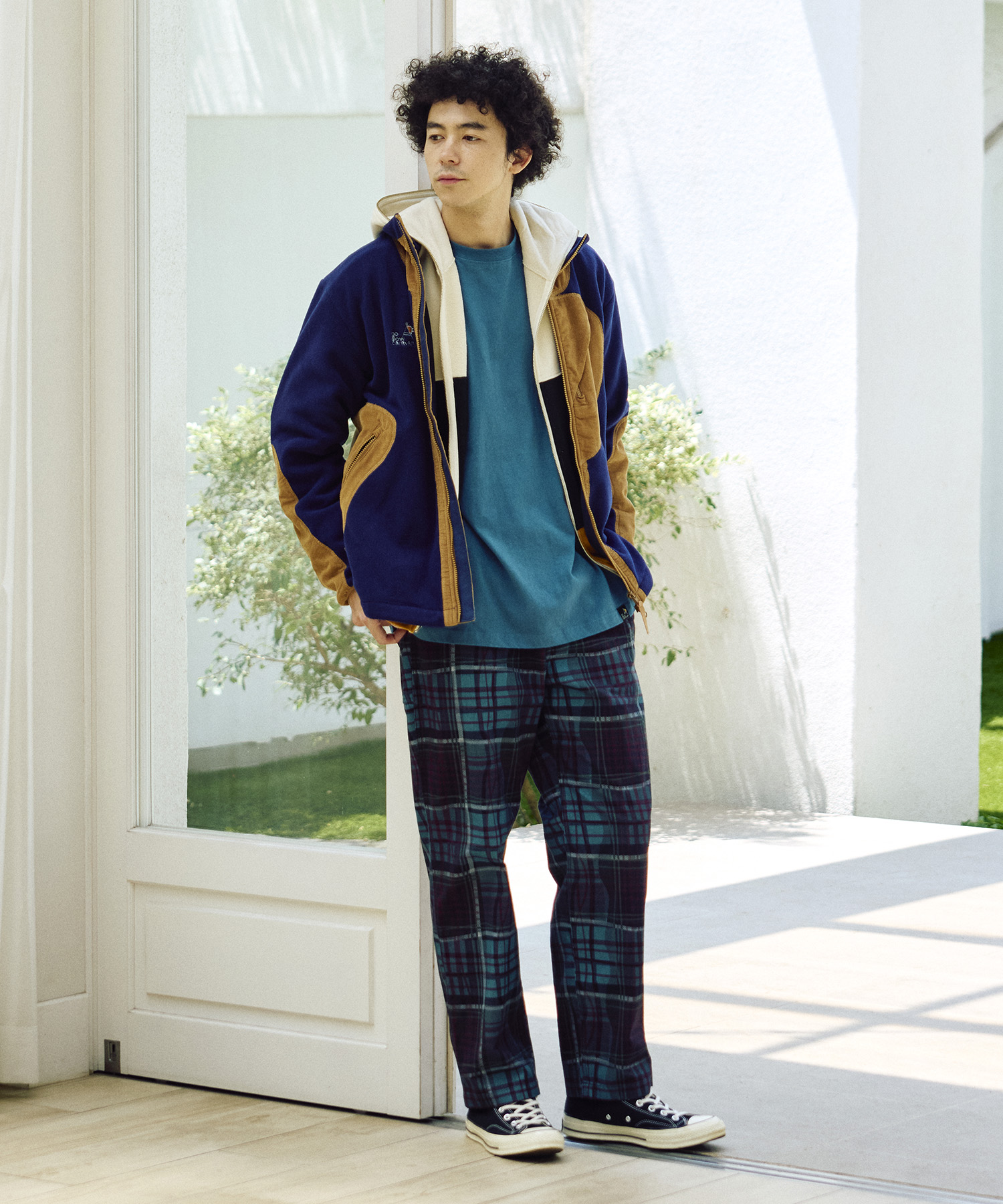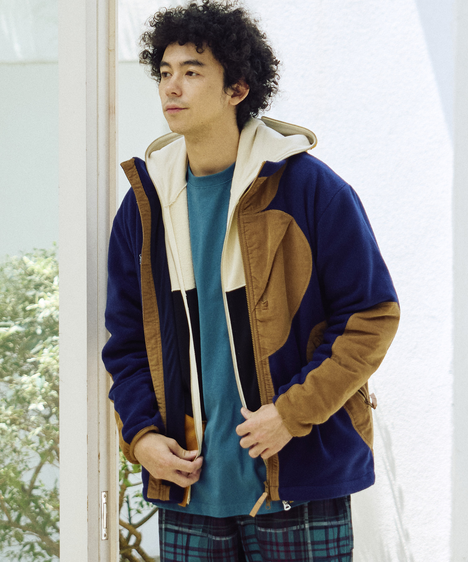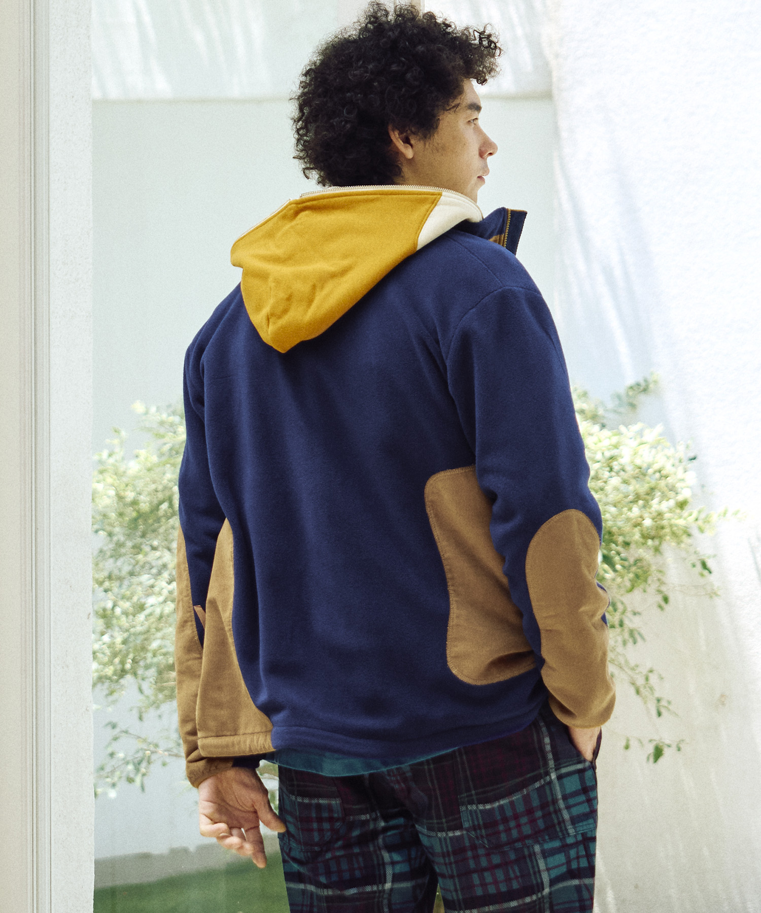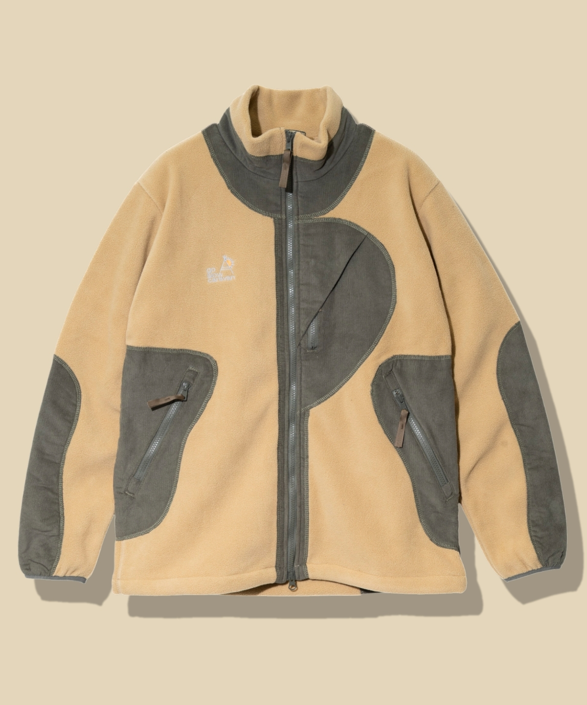 肉厚で暖かみのあるマイクロフリース素材に曲線でコーデュロイのトッピングを加えたミドルアウター。裏地にはメッシュを使用。