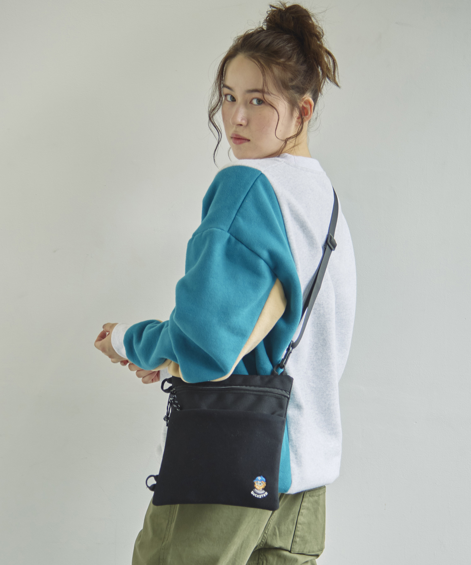 ポリエステルとスウェット素材を組み合わせた、軽量でカジュアルな2WAYサコッシュ。縦向き・横向きの2WAYで使えるデザインで、シーンやコーディネートに合わせて自由に持ち方を変えられます。