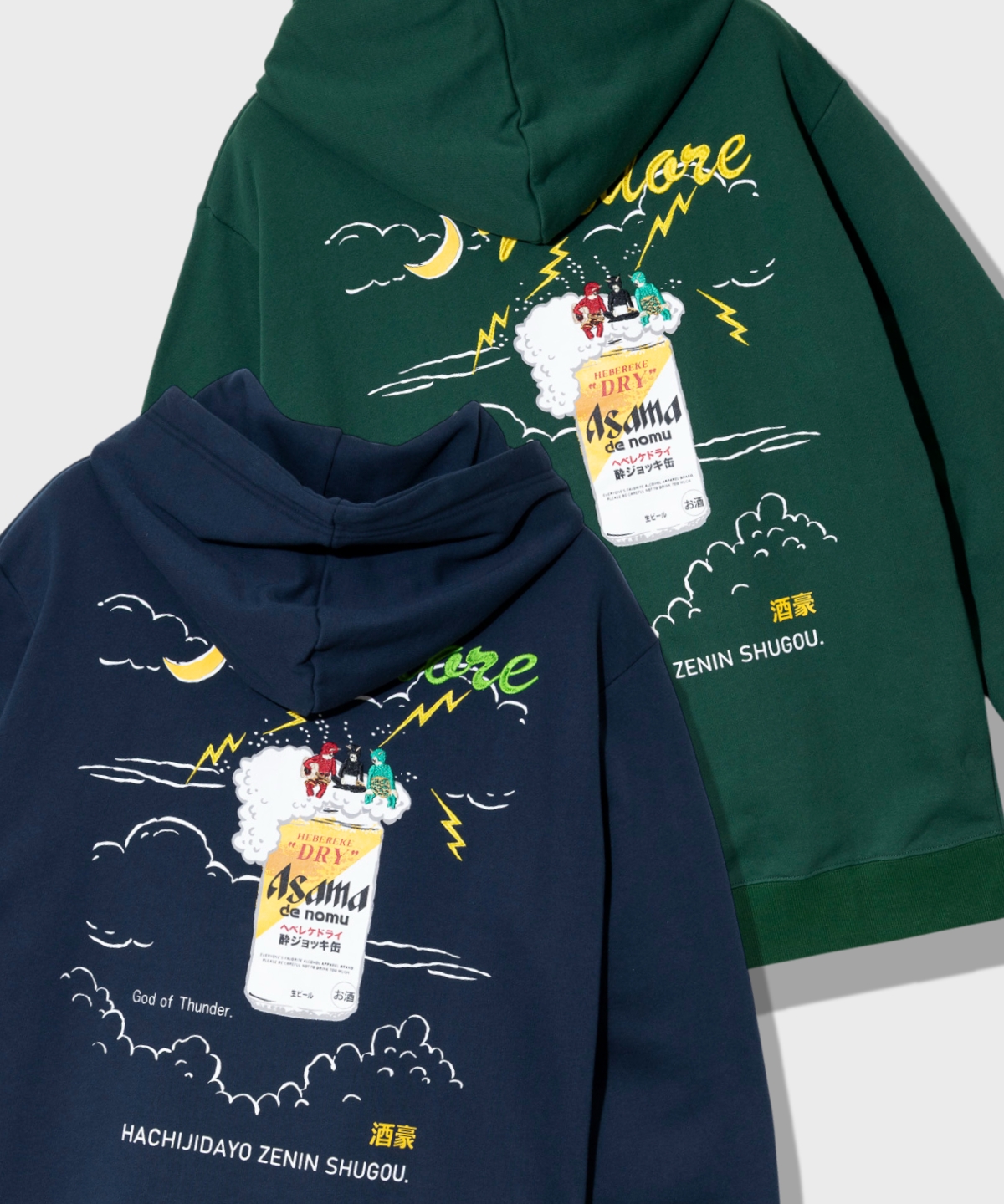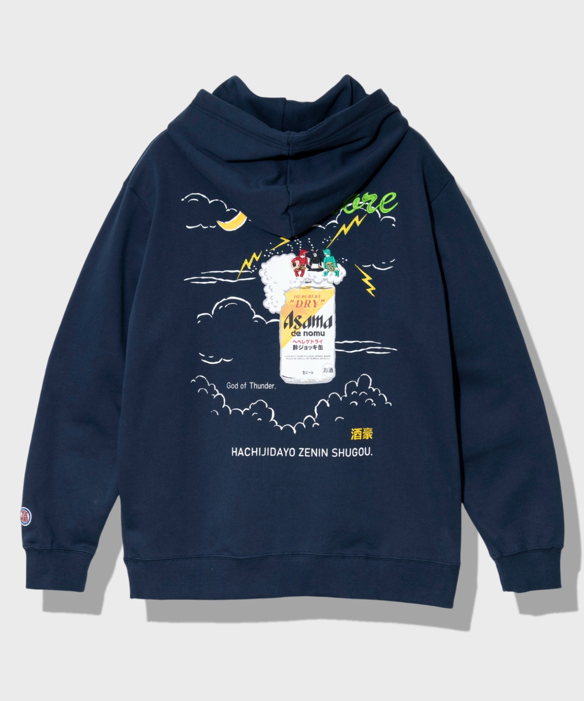 ビールの泡を雲に見立てて宴会に興じる雷様たちのデザインが実に秀逸。YOIDOERロゴはガッツリ刺繍で高級感爆上げです。実は毎回変更されているビール缶デザインにも注目。さりげなくロゴを読んでみると、、、細かい部分にストーリーや意味が込められているのです。