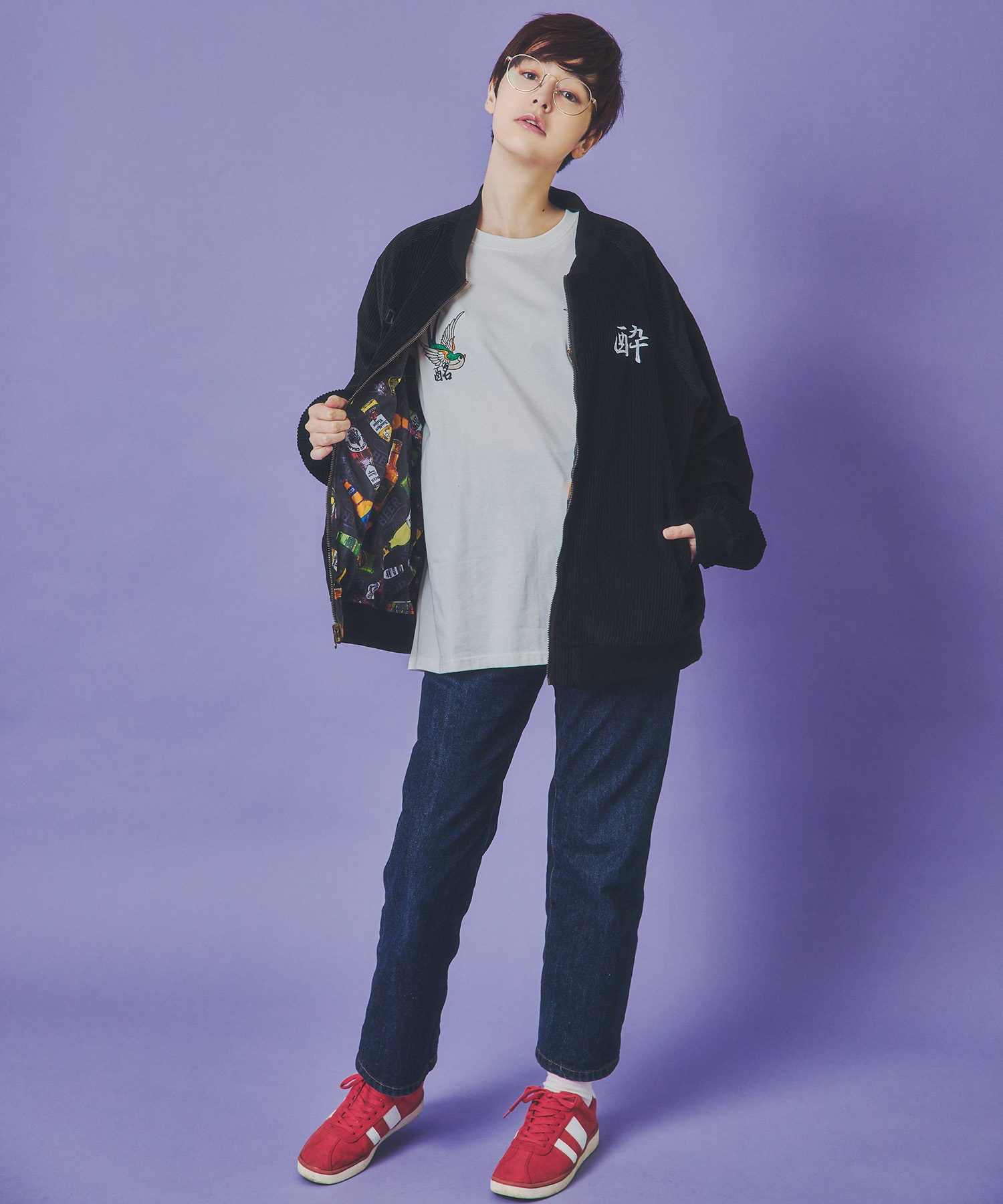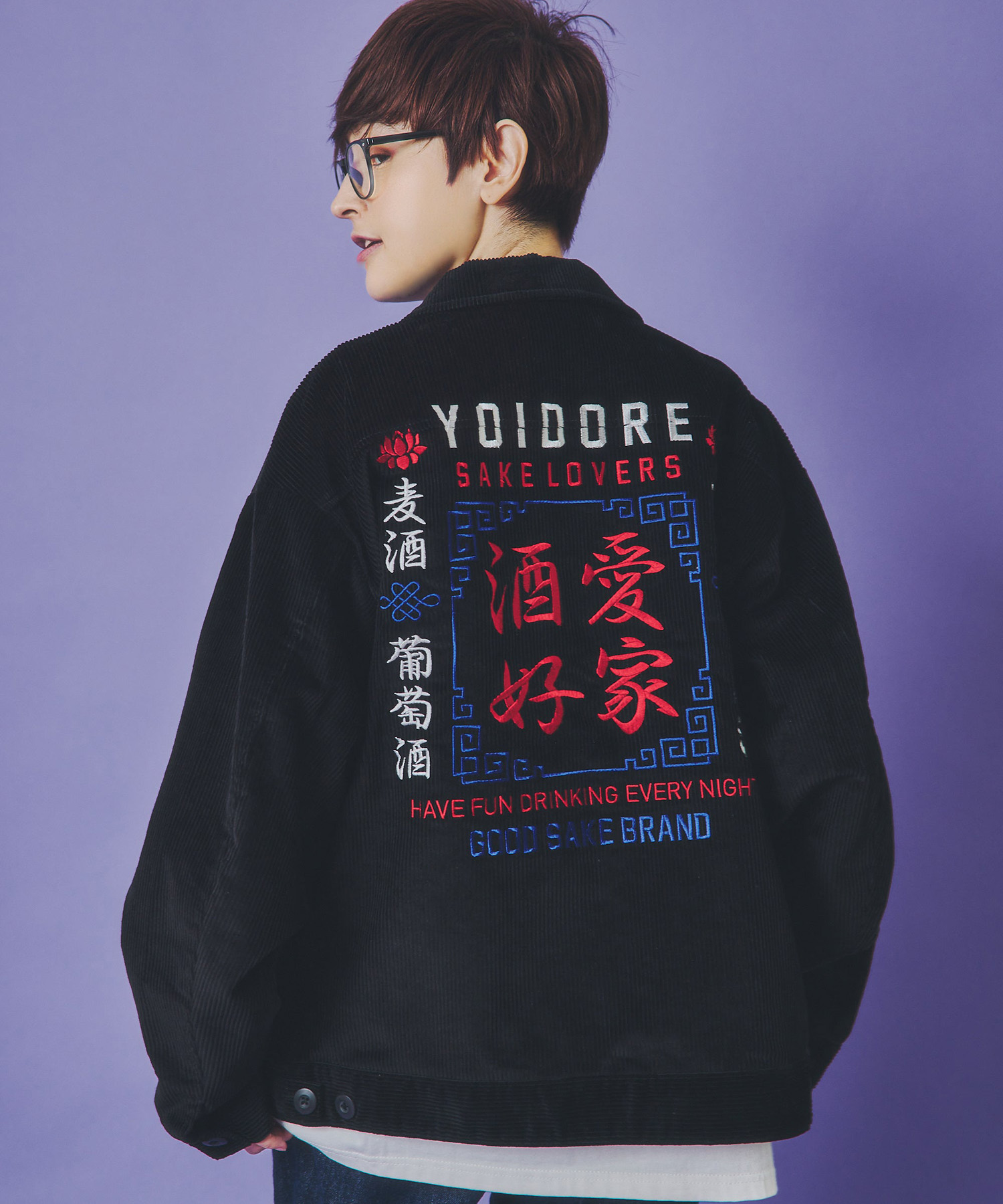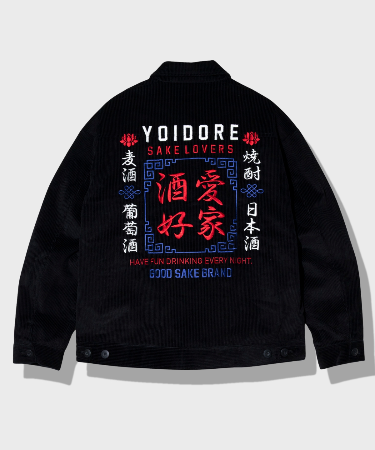 全てのロゴ、グラフィックが立体感のある刺繍でデザイン。張りのあるコーデュロイ生地を使用し、スイングトップのような型がオーセンティックな雰囲気を演出します。さりげなく裏地にプリントされた「酒愛」ブロックロゴが見えないところにも拘ったポイントです。