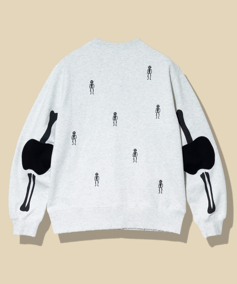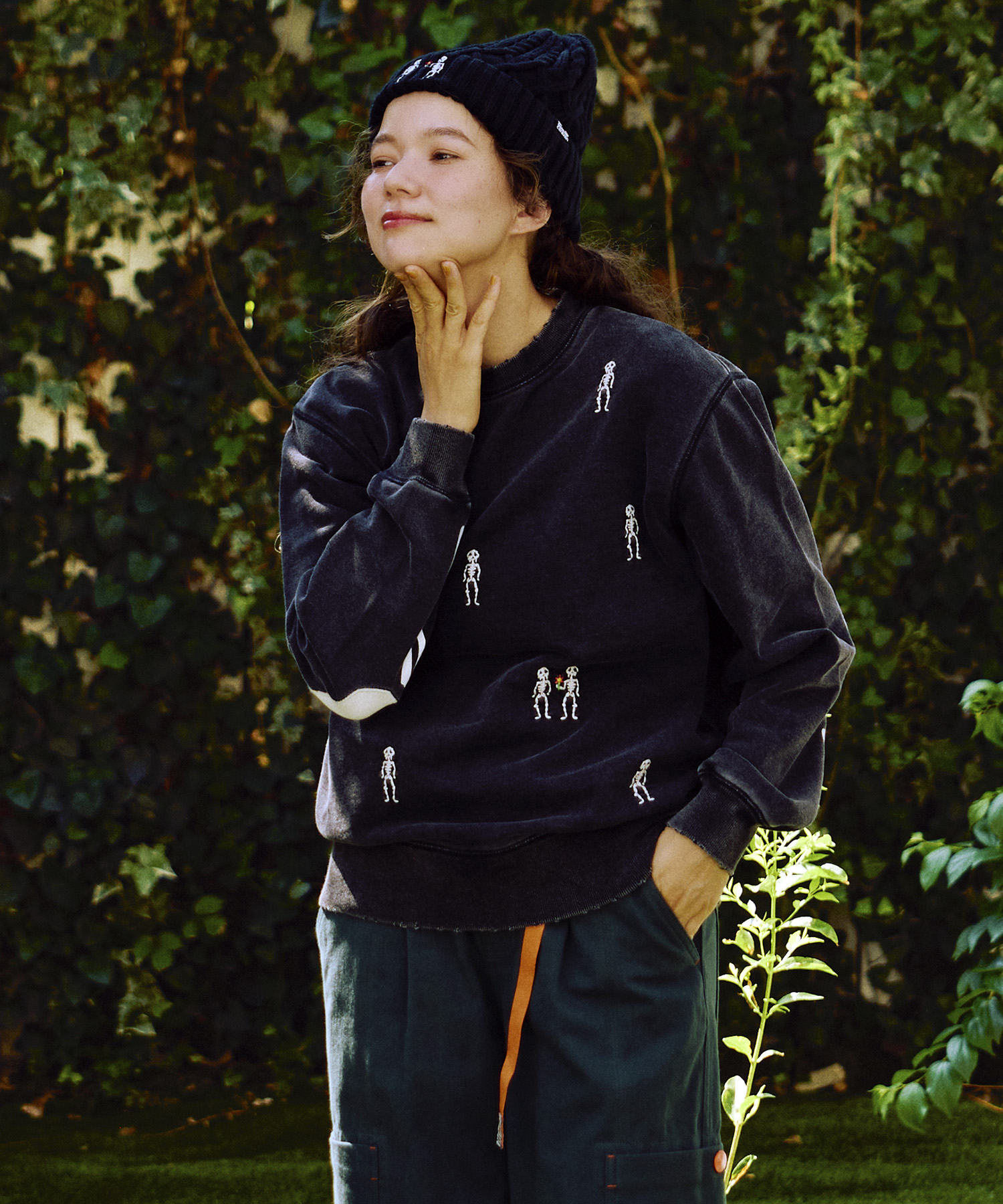 前後身にゆるい雰囲気のガイコツをハンド刺繍のような太糸で表現。袖は、エルボーパッチと骨プリントが入り。ダメージ製品洗い加工で、刺繍とマッチしたちょいボロに仕上げたクルーネックスウェットが登場です!