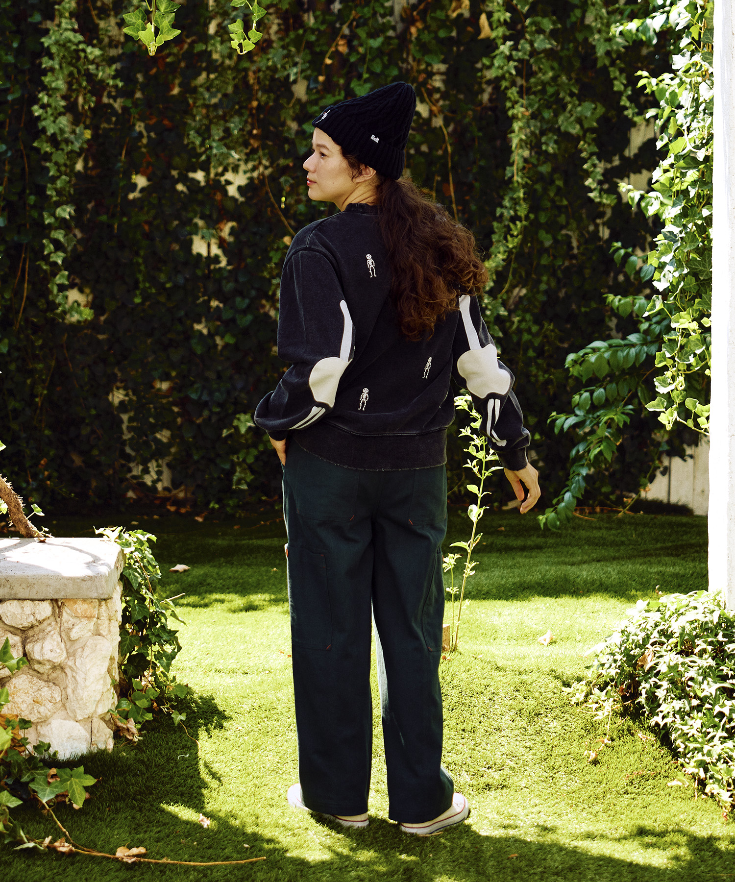 袖にはエルボーパッチと“骨プリント”をプラス。ボディ全体にはダメージ加工と製品洗いを施し、絶妙な“ちょいボロ”感に仕上げています。刺繍と加工の風合いがマッチした、go slow caravanらしいユーモアとクラフト感を感じる一枚。