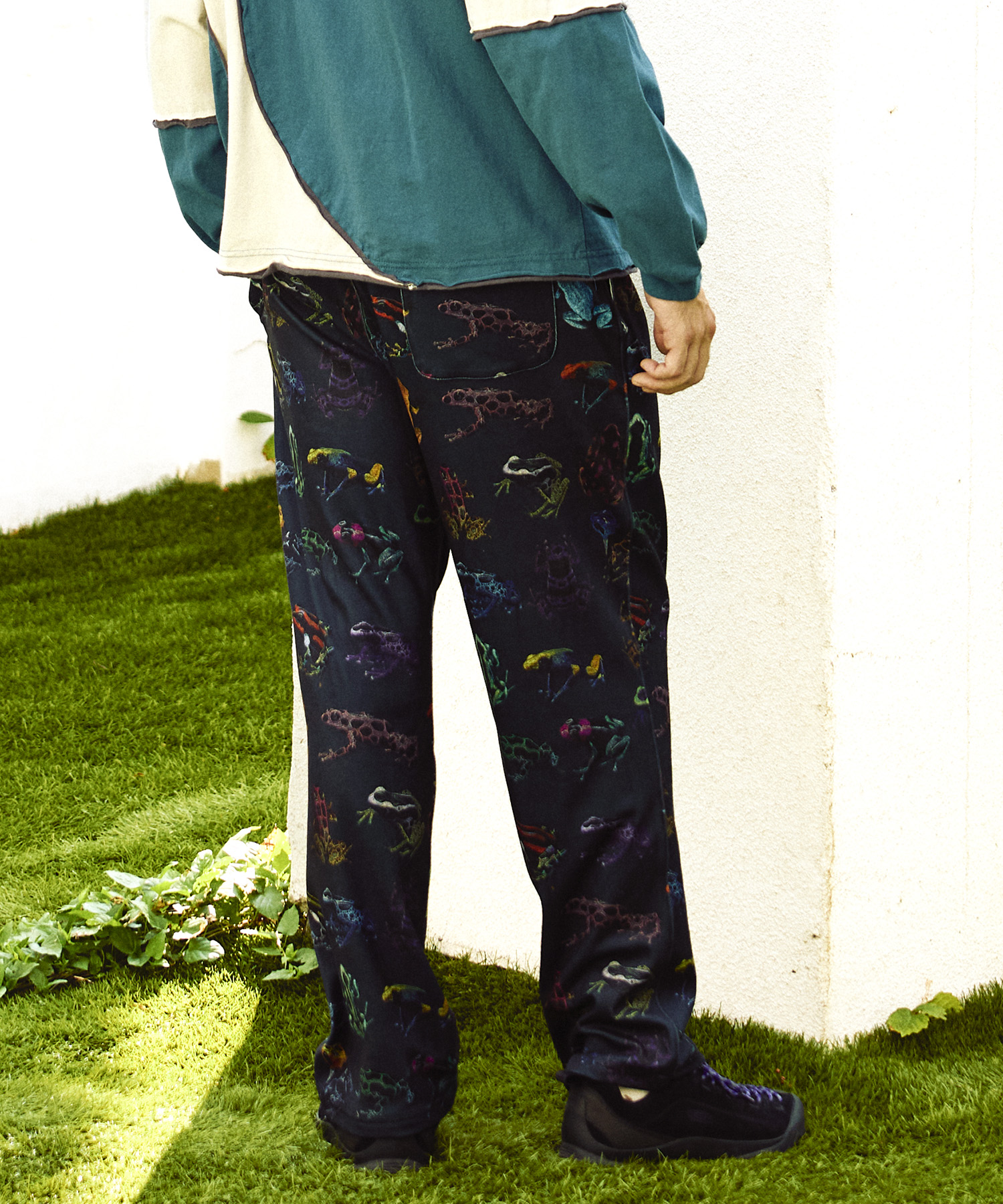 しっとりなめらかなスムース生地に総柄を転写プリントしたアイテム。今季の柄は《ヤドクガエル図鑑》と《柴犬と晩酌》がラインナップ。伸縮性に優れた生地で、まさに“寝るまで1日中着ていたい”リラックスアイテムです。インナー使いにも、軽い羽織りとしても、テント内のリラックスタイムにもおすすめ。