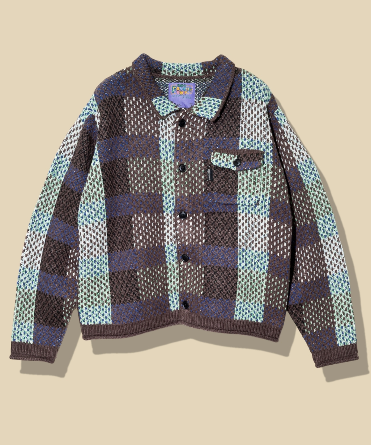 オリジナルの大判チェック柄をミドルゲージニットに落とし込んだシャツジャケット。太さ、風合い、色味の異なる糸を複数を組み合わせ編み立てた柄は、深みのある風合いに。胸ポケット付き、着丈のやや短いワイドシルエット。袖口と裾口は、編地を途中で切り替えくるりと丸まる仕様。