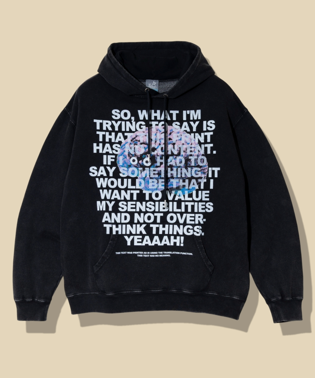 古着のような色褪せ加工を施したフーディー。前面には、NOUちゃんの上からメッセージ「I HAVE NOU IDEA」をプリントし、遊び心のあるデザインに仕上げています。ライトオンスの裏起毛スウェット素材で、秋冬シーズンを通して快適に着用できる一枚です。