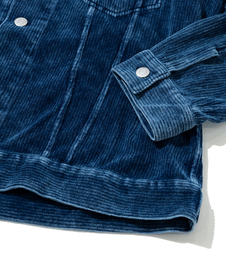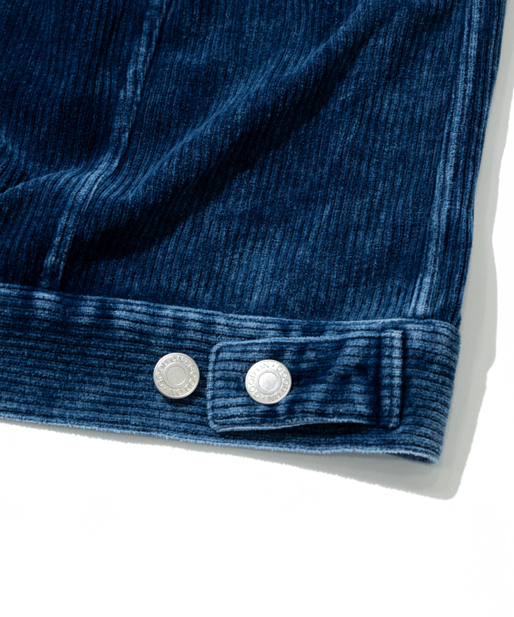 オーガニックコットンを使用したオリジナルファブリック“ニットコーデュロイ”の生地感を生かしたGジャンを独自のインディゴ染めとシェイブ加工でビンテージデニムのような表情に仕上げた限定品。熟練の職人が一点ずつ丁寧に染色加工を施した特別な逸品です。