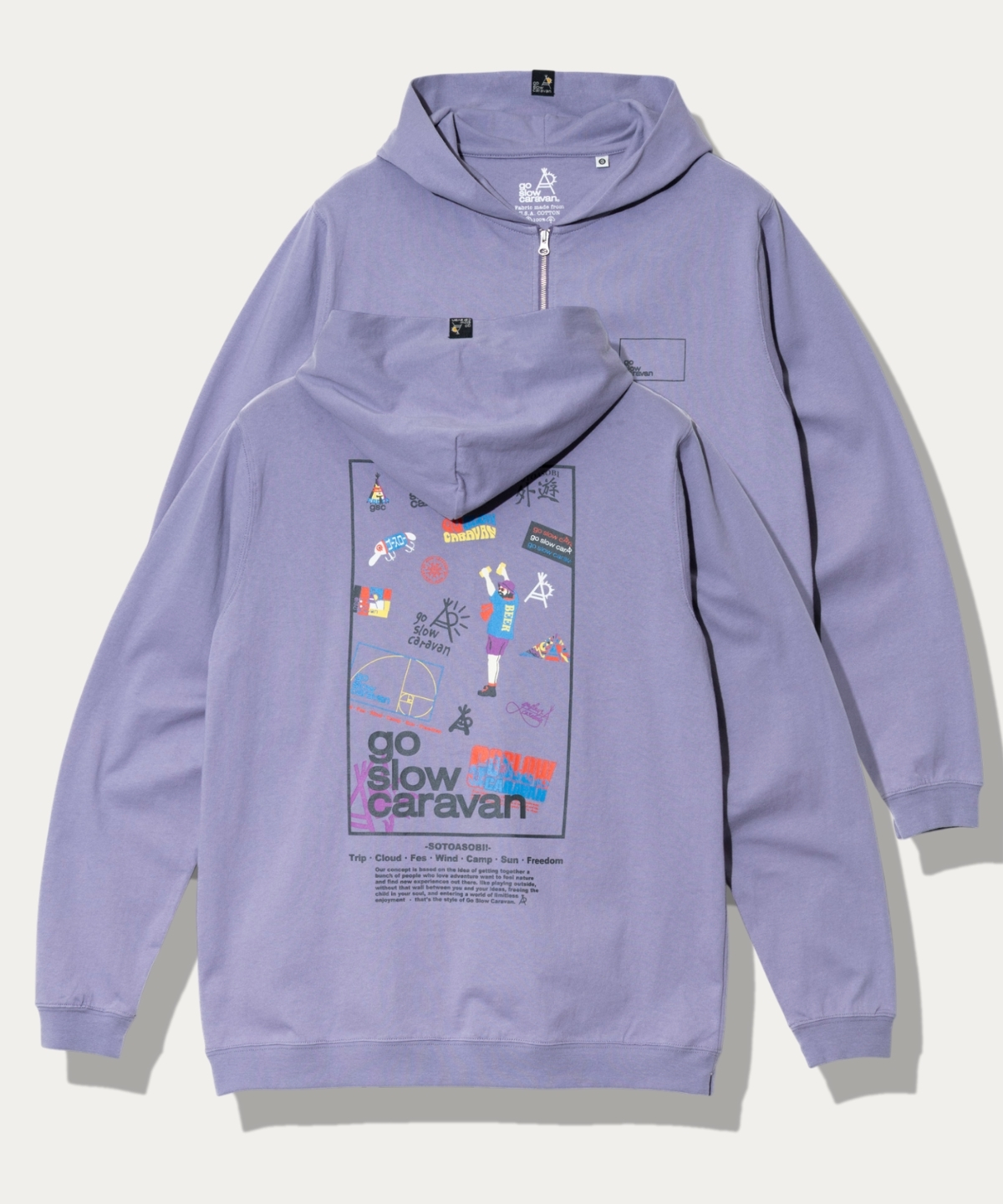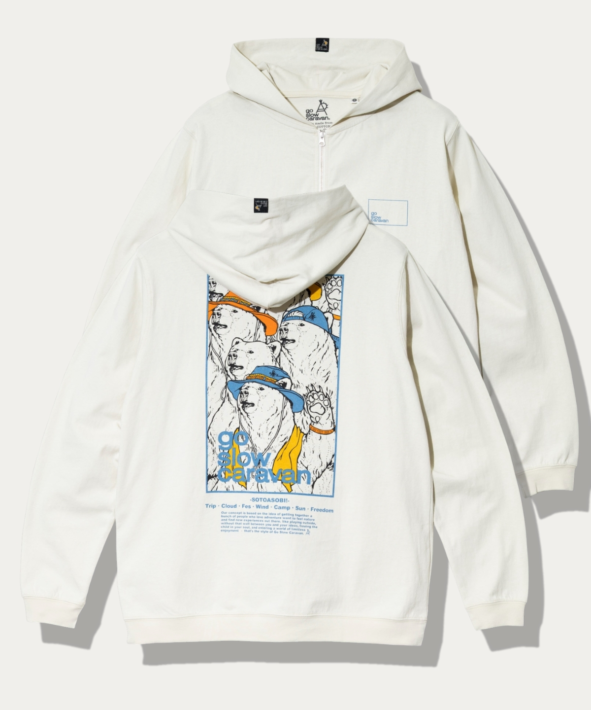 背中にはゴースローキャラバンらしいイメージグラフィックとコンセプトをプリントしたスクエアロゴシリーズにZIPフーディーが仲間入り☆レギュラーシルエットのベーシックなアイテムですが、メタルファスナー使いや袖口と裾口の切れ込み仕様がさり気なくアクセントに。ライトな羽織として重宝するアイテム
