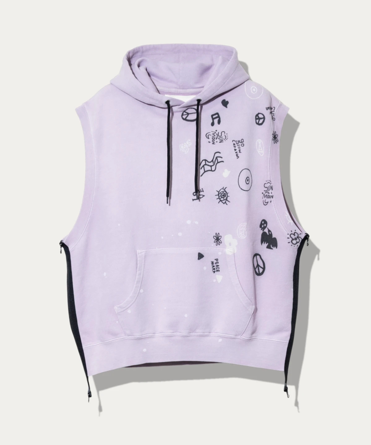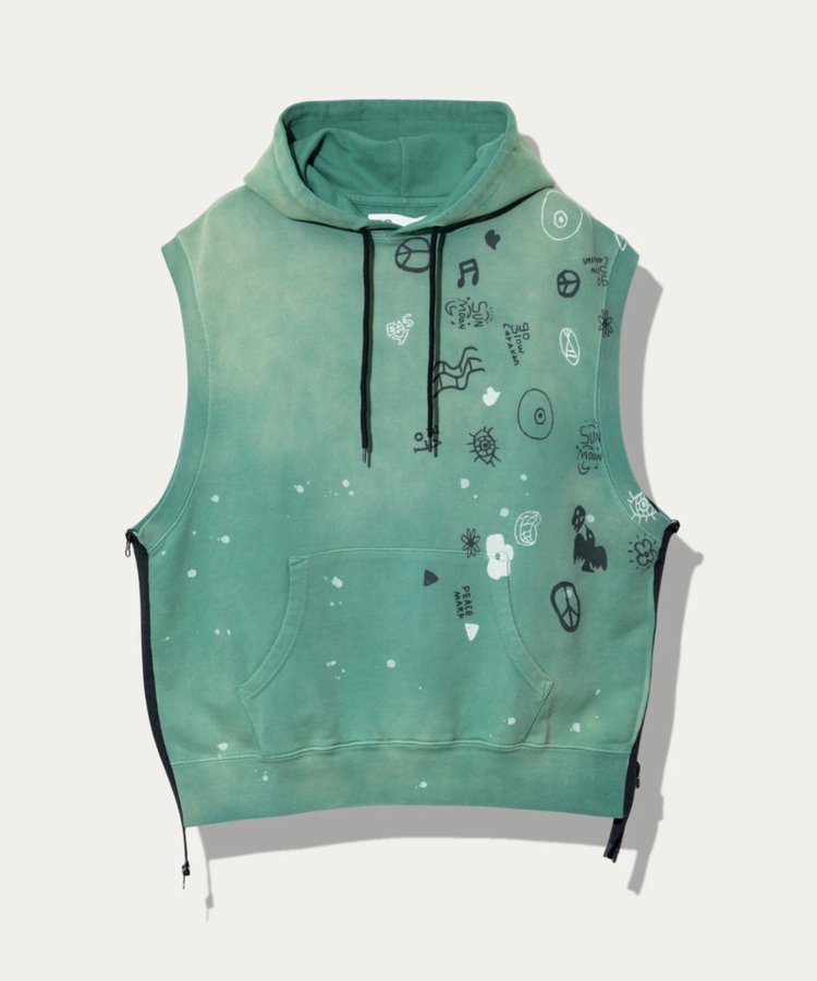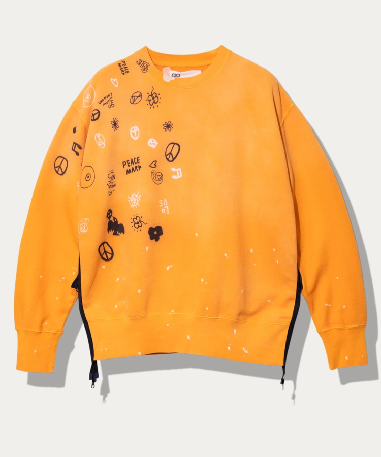裏毛よりも厚みを抑えた生地感で、長いシーズン活躍するアイテム。製品染め後にペンキ飛ばしやフェード加工を施し、各パーツをまたぐプリントを重ねることで、USED感のある雰囲気に仕上げています。
