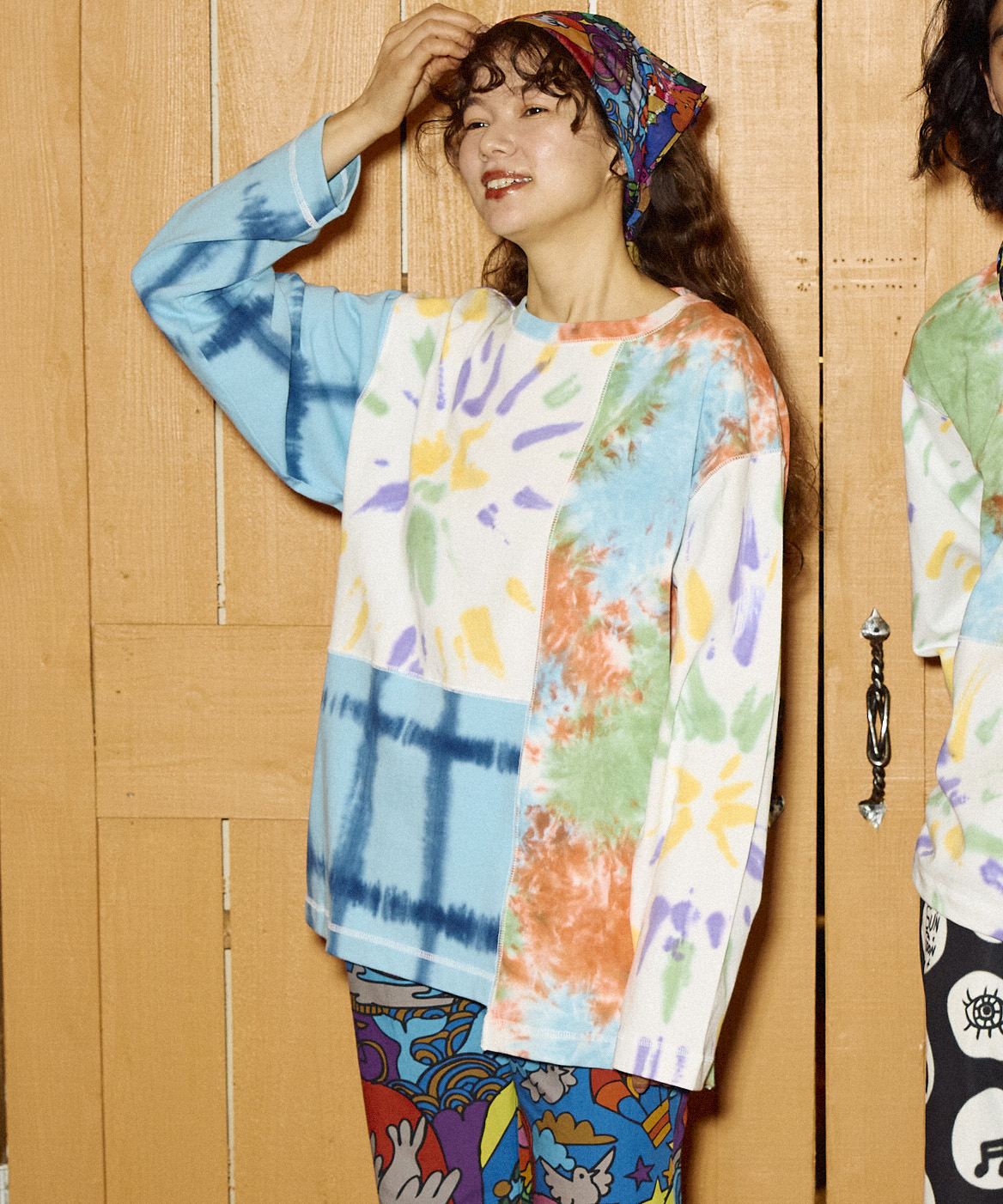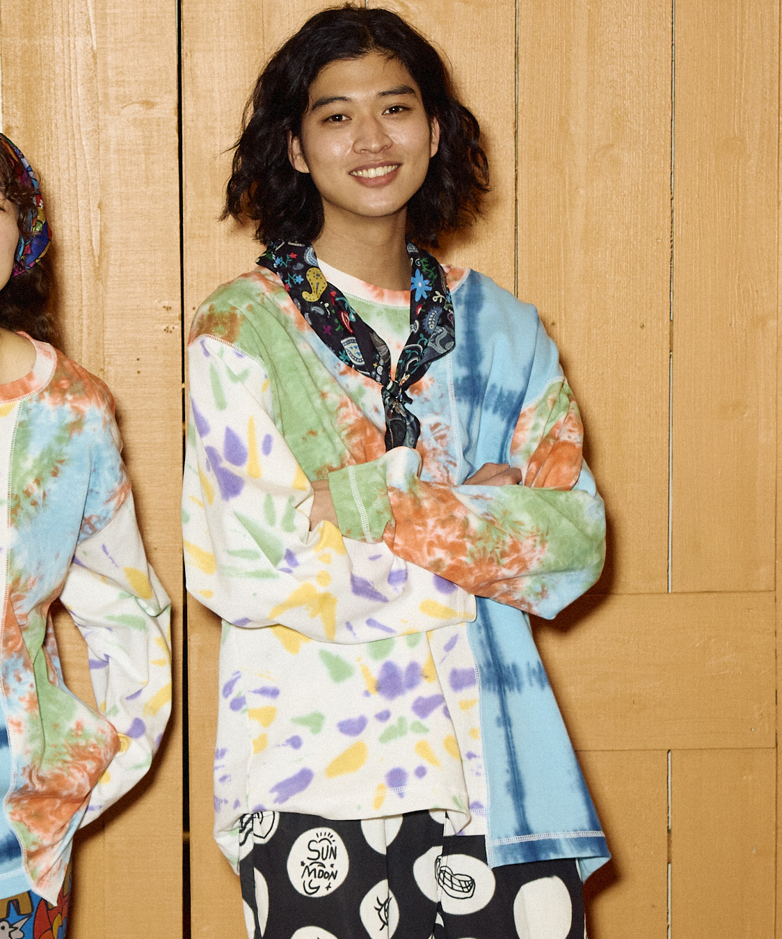 各パーツごとに異なる色柄のタイダイ染めを施し、3本針ステッチで大胆に切替えた存在感抜群のデザイン。不規則なパネル切替や段違いの裾など、細部までこだわったディテールが光るスペシャルな仕上がりです。ゆったりとしたシルエットで、1枚で主役になるアイテム。シンプルなボトムと合わせるだけで、個性的なスタイリングが完成します。