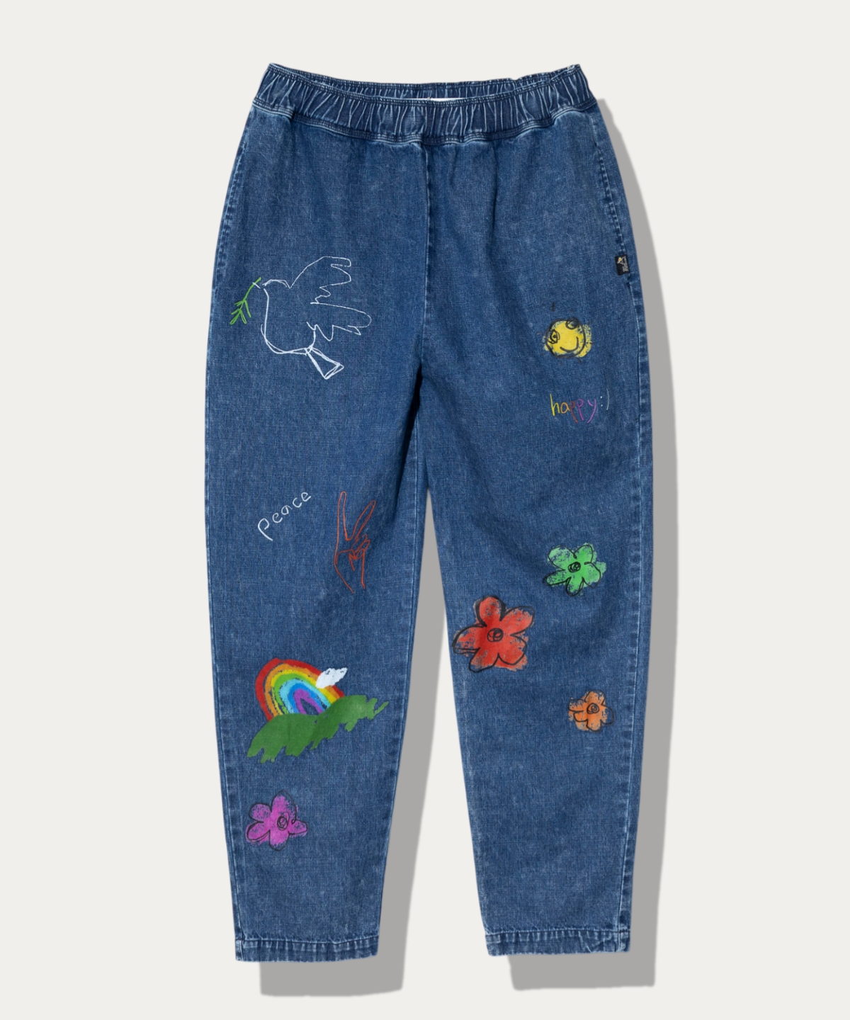 前後にピースフルなモチーフのプリントが入ったイージーパンツ。総柄プリントとは違う印象のパーツプリント。ゆったりしたテーパードシルエットでウエストはゴム&スピンドルのリラックス仕様。