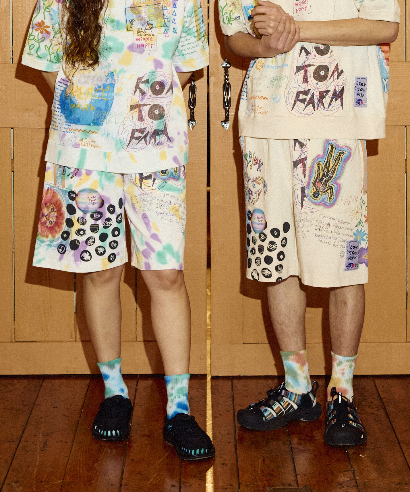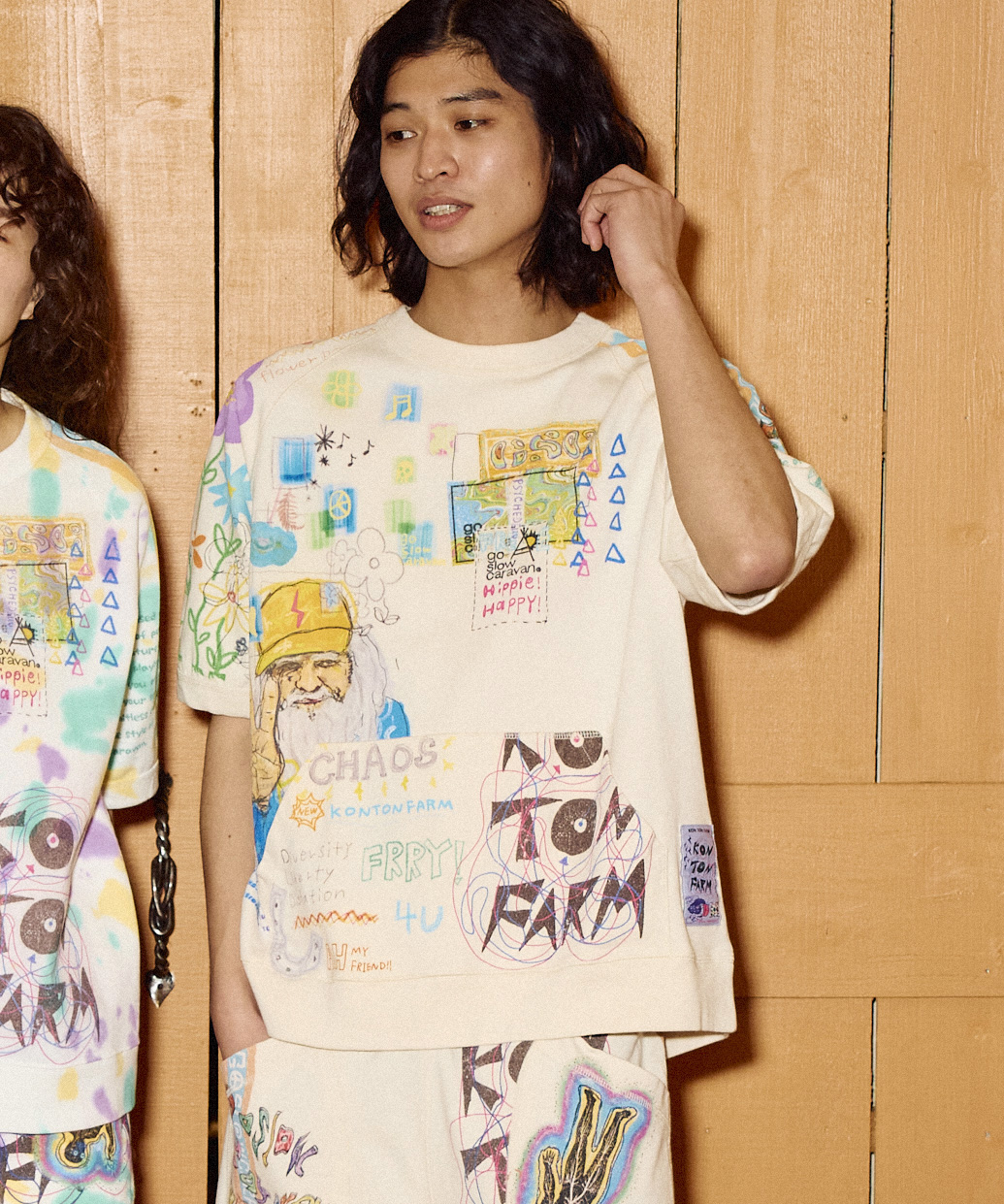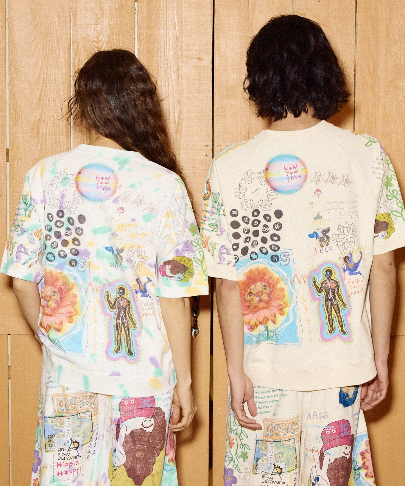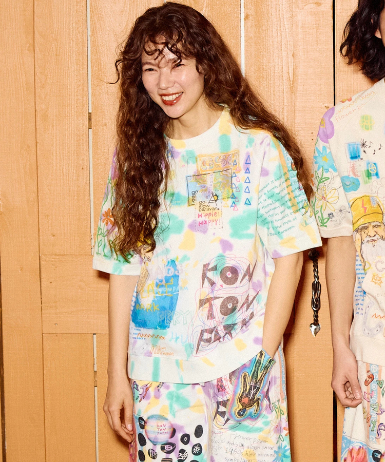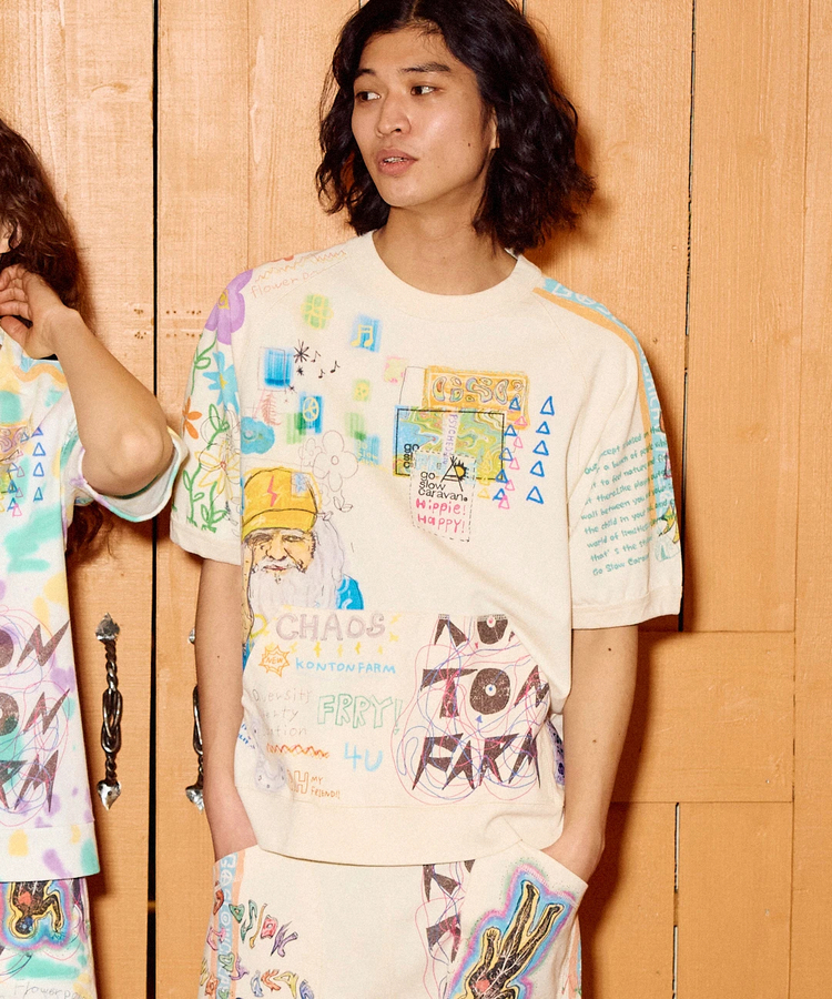 ゴースローキャラバンをテーマに様々なイラストや素材をMIX。いたるところに落書きしたコラージュ作品のようでカオスなシリーズ。カンガルーポケット付きのラグランTシャツと、タイダイバージョンはプリントを意図した位置に施す為に、染め後に縫製を解きプリントをして再び形にする手間をお惜しまない工程を踏んだ、よりスペシャルなアイテム。