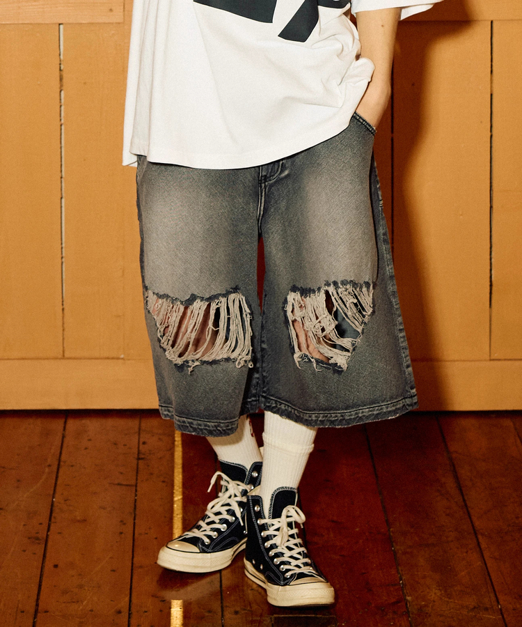 落書きカオスラグランTEEと同じく、滑らかな肌触りと強度を両立したヘビー天竺生地を使用。膝~膝下の丈感で外側に縫い目のない仕様に。リラックスできるサイズ感で前後にはパッチポケットを配置。