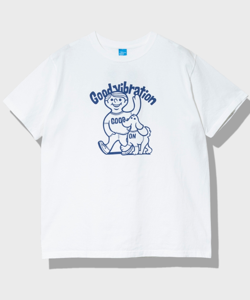 ポジティブなメッセージを感じさせる「GOOD VIBRATION」グラフィックが印象的なプリントTシャツ。シンプルながらも雰囲気のあるデザインで、スタイリングにさりげないアクセントを加えてくれる一枚です。