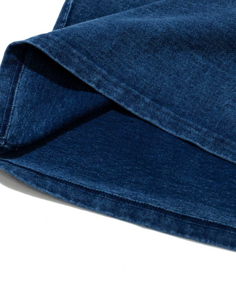無骨で重量感のある9オンスヘビージャージーを使用したシンプルなセットインスリーブクルーネックTシャツを、独自のインディゴ染めとシェイブ加工でビンテージデニムのような表情に仕上げた限定品☆熟練の職人が一点ずつ丁寧に染色加工を施した特別な逸品です。