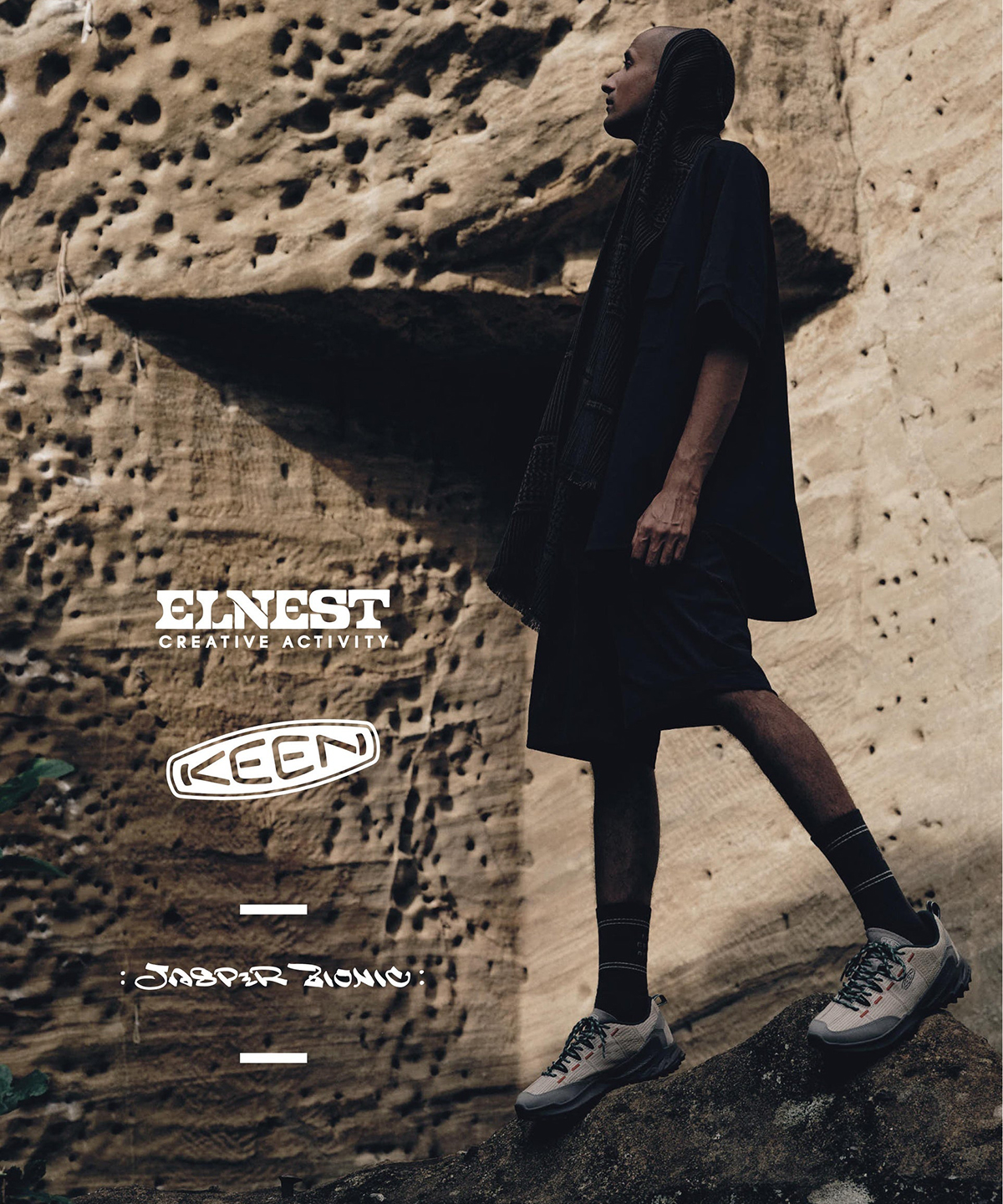 「旅」を通じて自然と街をつなぐ、国産にこだわったアクティビティ・ウエアを提案する《ELNEST CREATIVE ACTIVITY》コラボレーションモデル。藁や蓑をイメージしたオリジナルのグラフィックをレーザー加工にて再現した唯一無二のスペシャルモデル。グラフィックは、業界の黎明期から活躍するクリエイター「NESM1」が作成