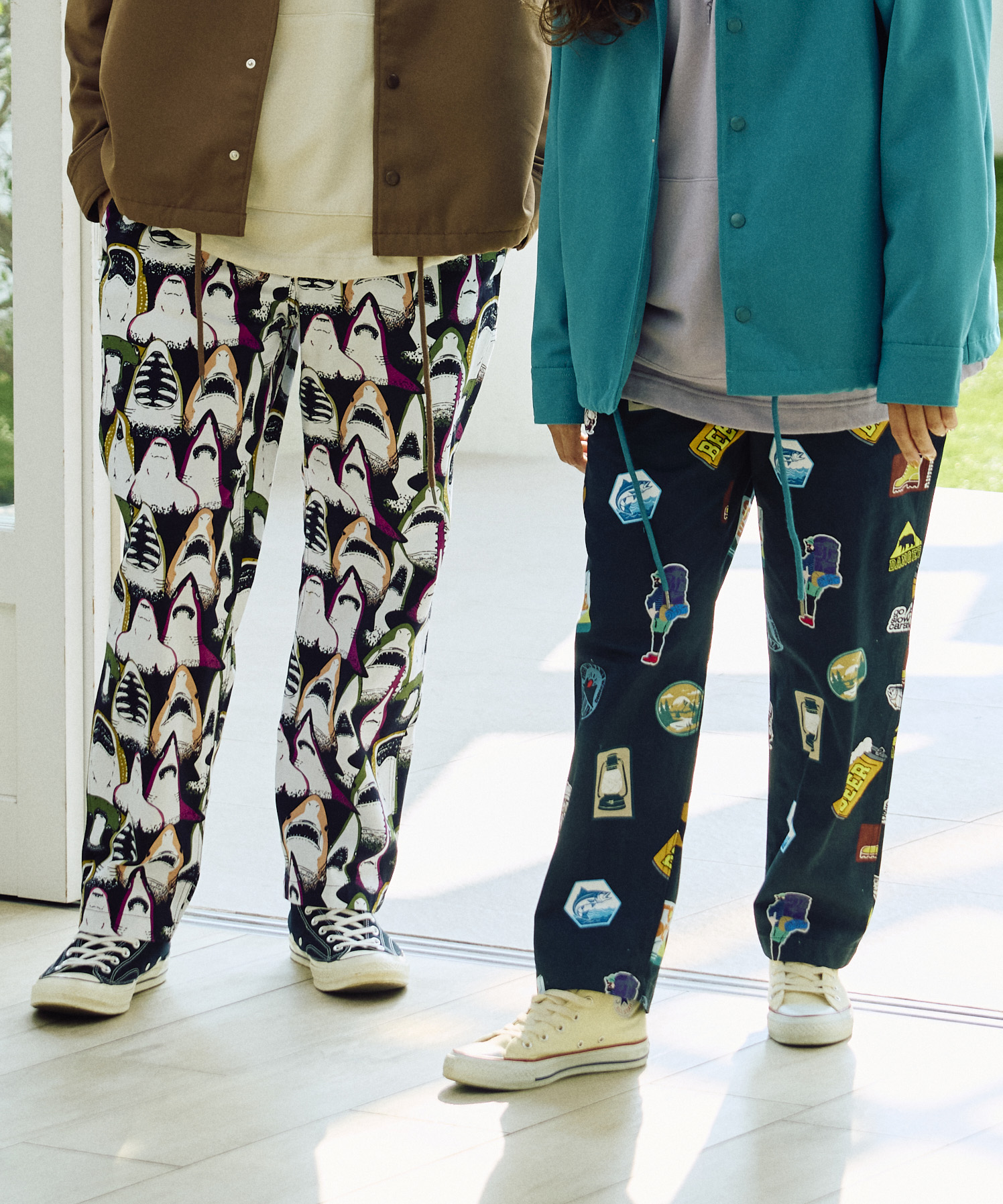 ライトなコットンキャンバス生地にオリジナルの総柄プリント。 ウエストはウェービングベルト仕様でイージーな着脱が可能。ゆとりのある腰回りから裾にかけて緩やかにテーパードしたシルエットは、リラックス感とすっきり感を両立しています。