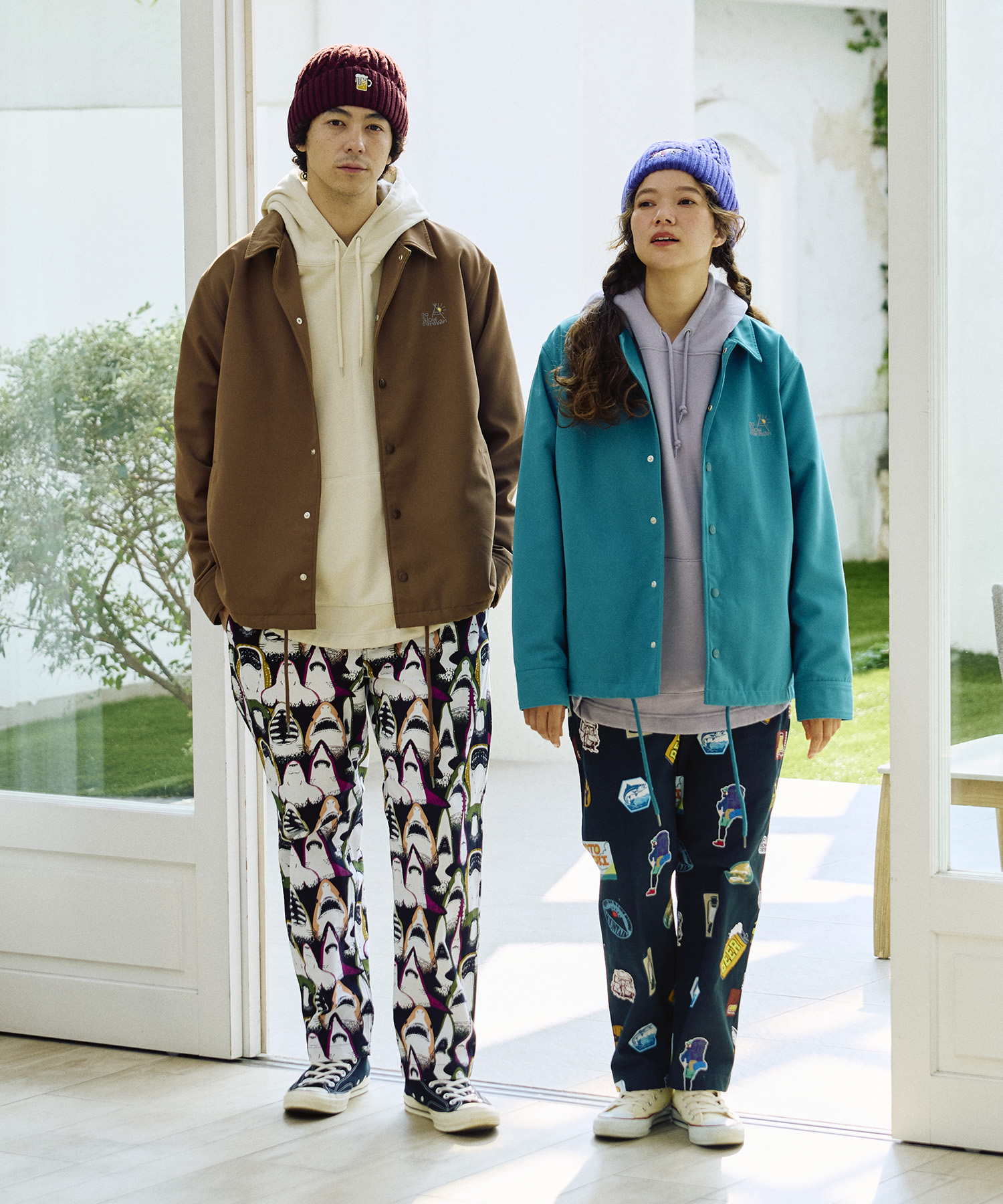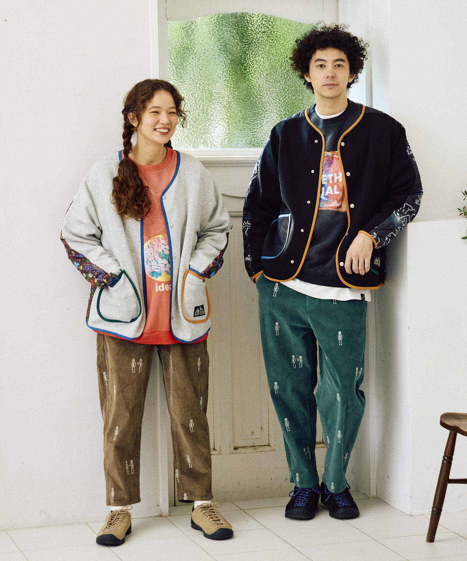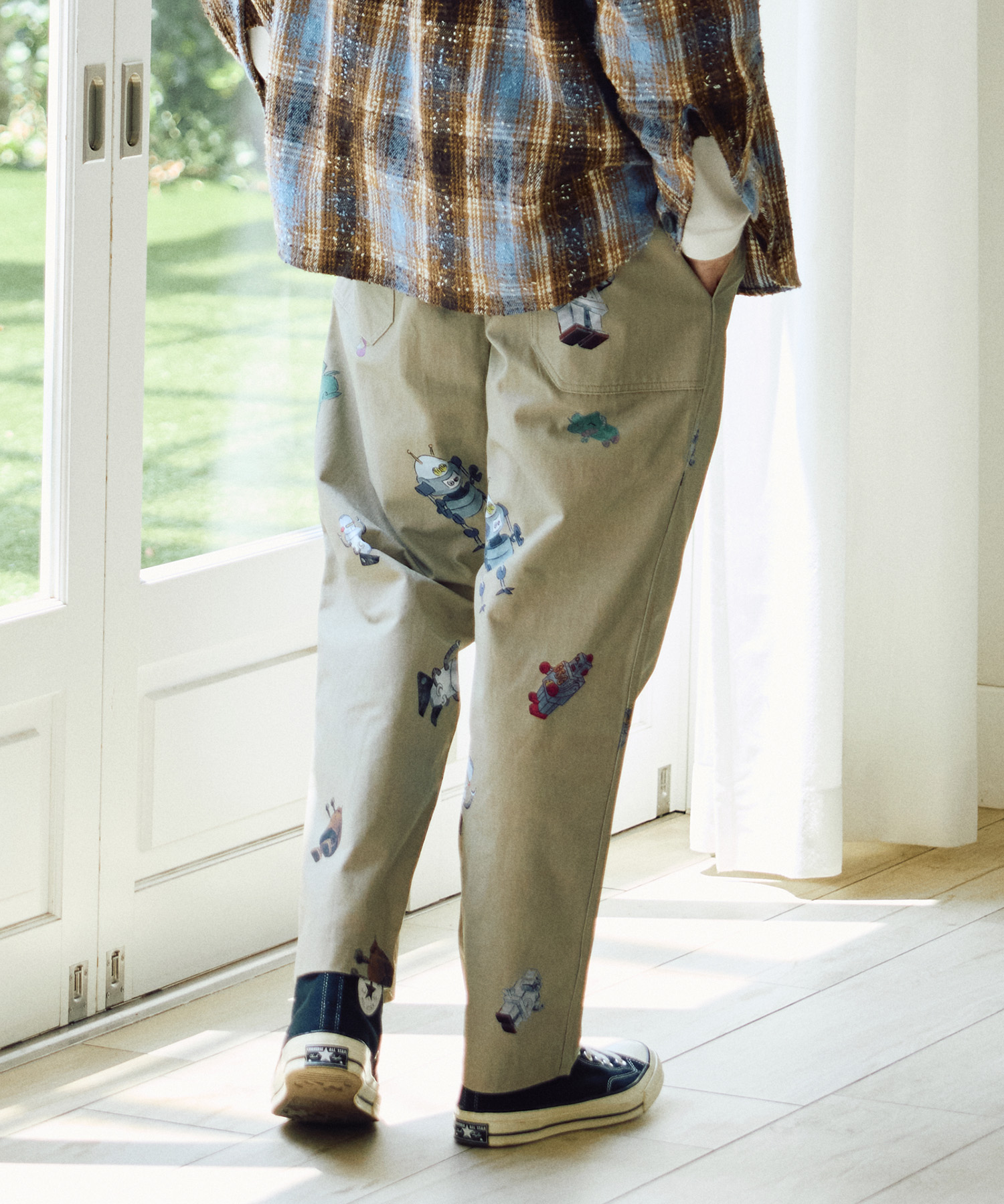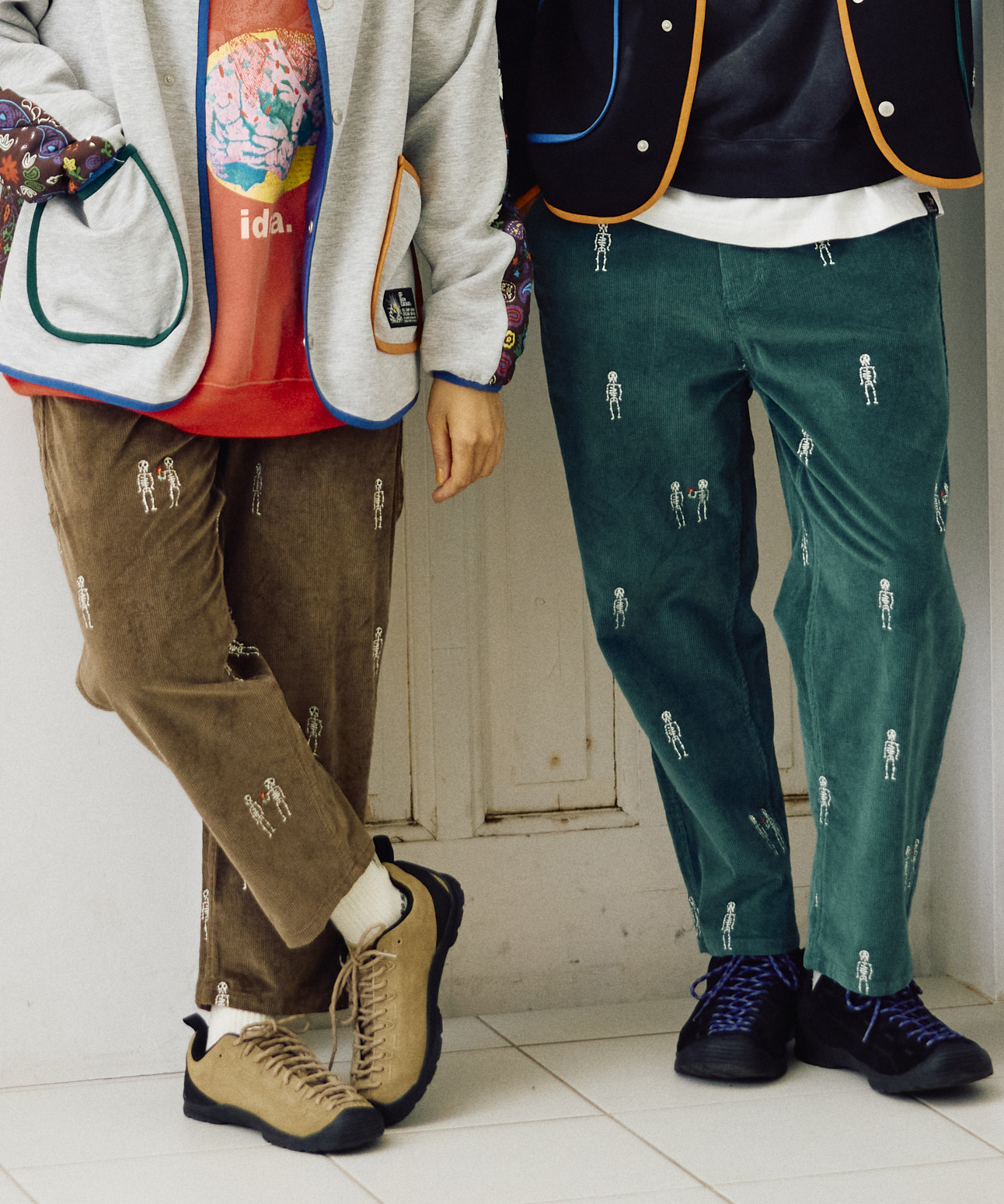 ストレッチ性があり、しっかりとした生地感のコーデュロイ生地にキュートなホネホネを総柄で刺繍したパンツが登場。昨年のウーパールーパー柄にも引けを取らない存在感。腰回りはルーズでテーパーしたシルエット。ウエストは平ゴム+ベルトループ仕様なので利便性も高いです。