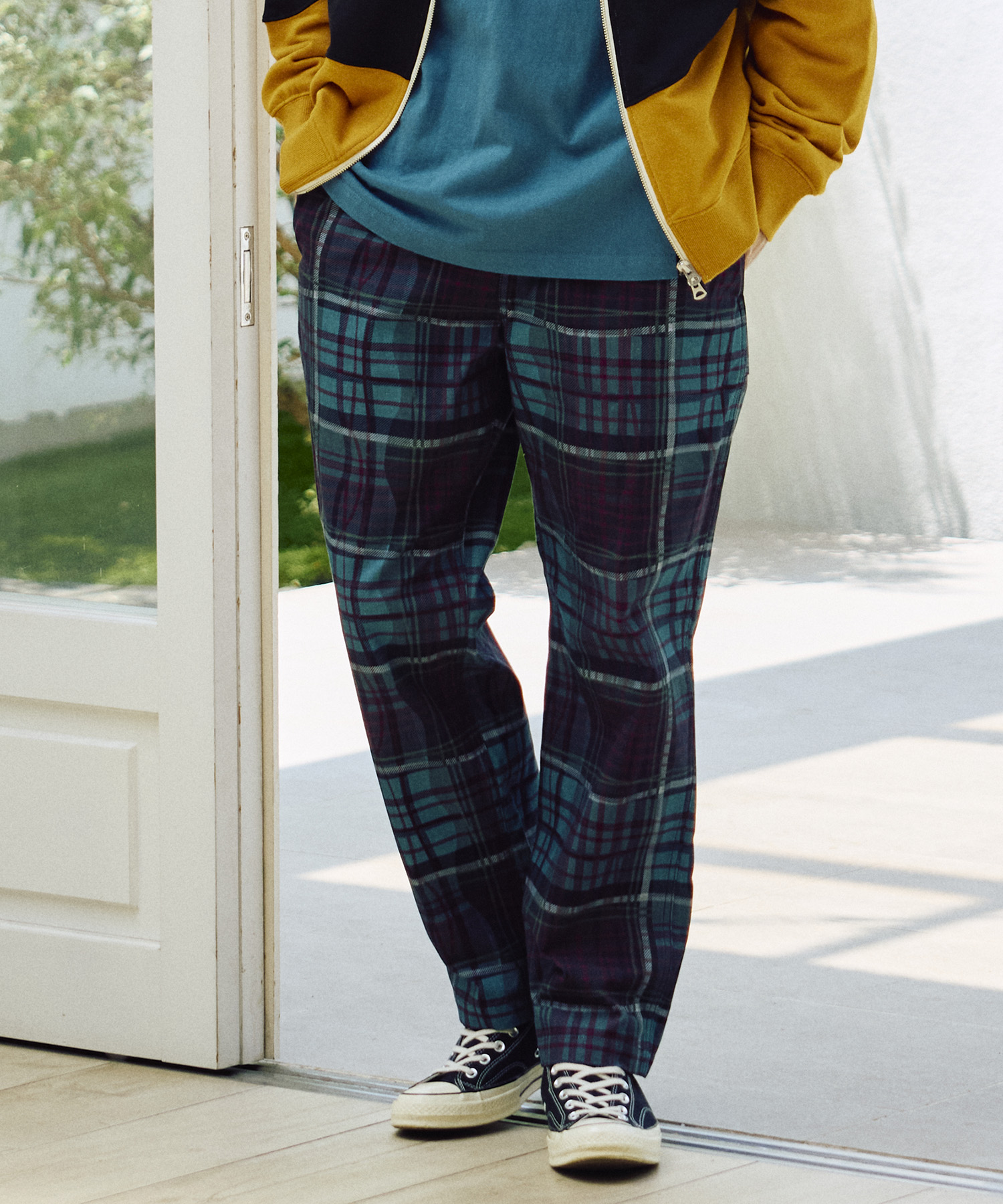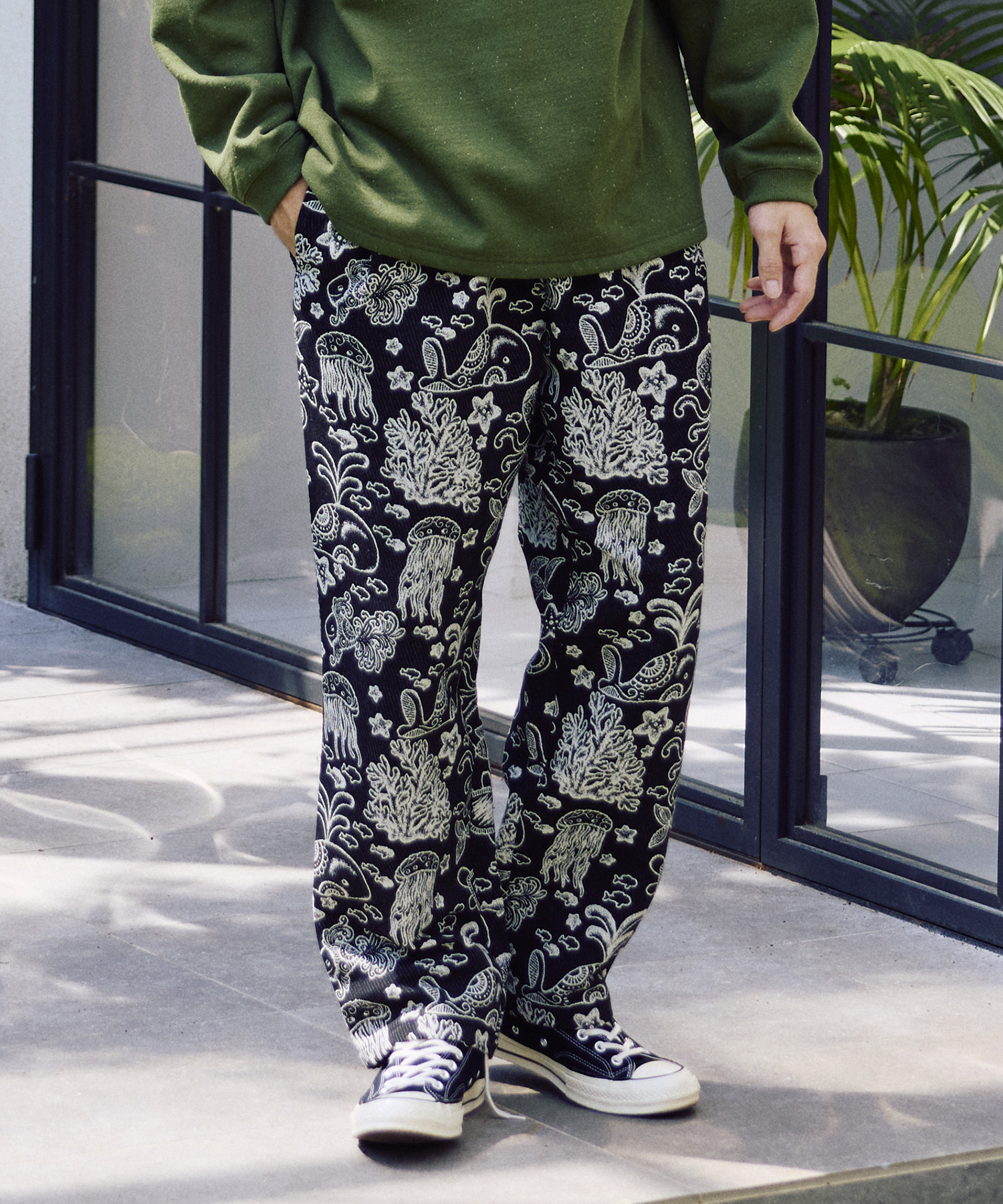 柄、素材感ともにインパクトのある「ゴブラン織り」のパンツ。ゆったりとしたサイズ感でウエストはゴム&スピンドルも兼ね備えたイージー仕様です。