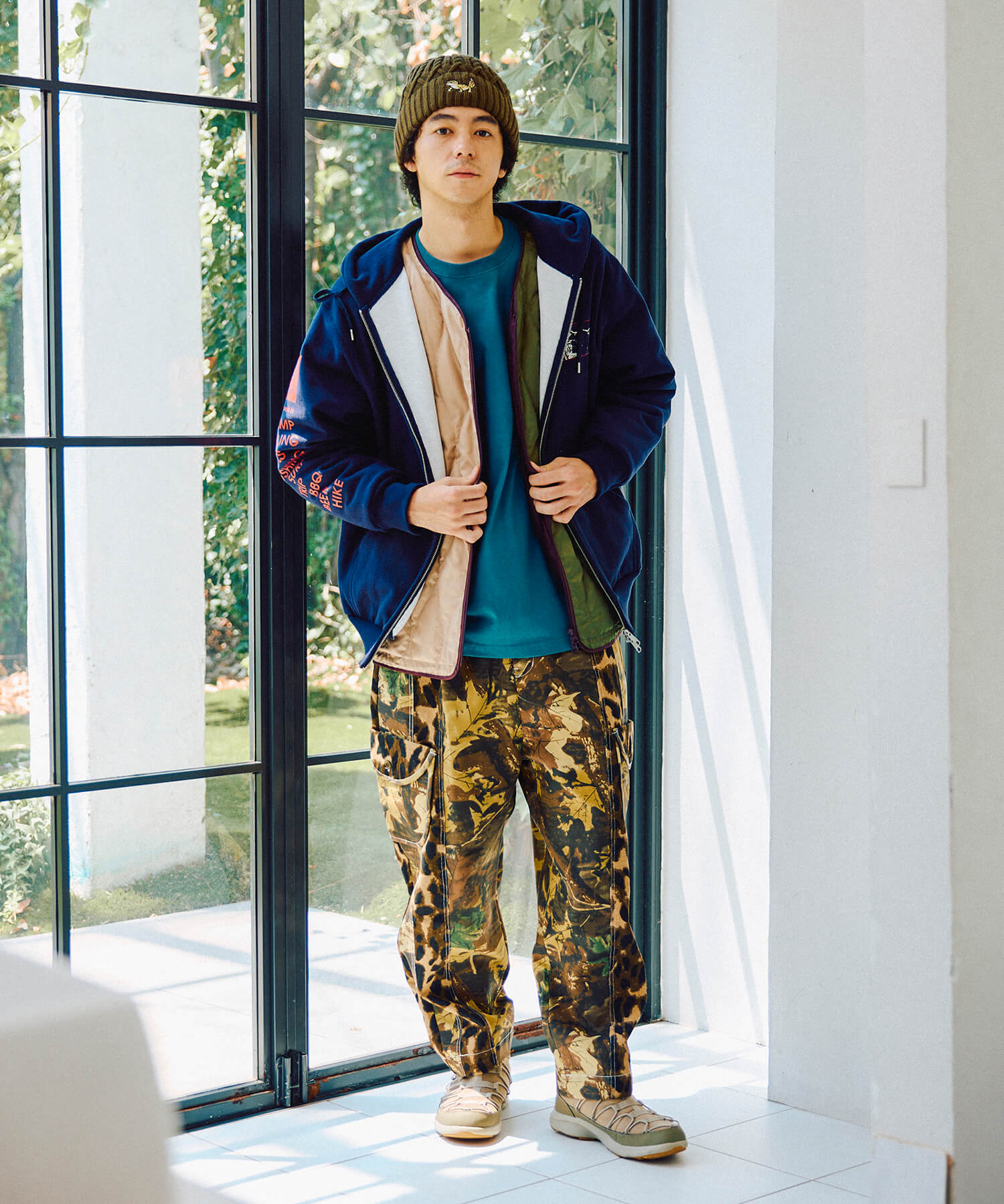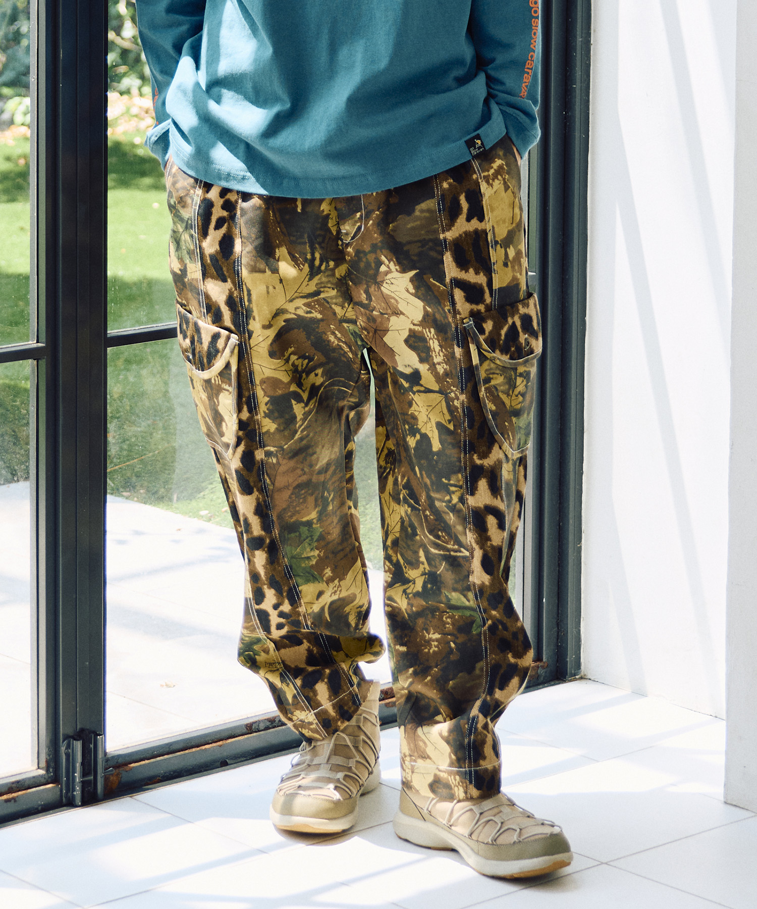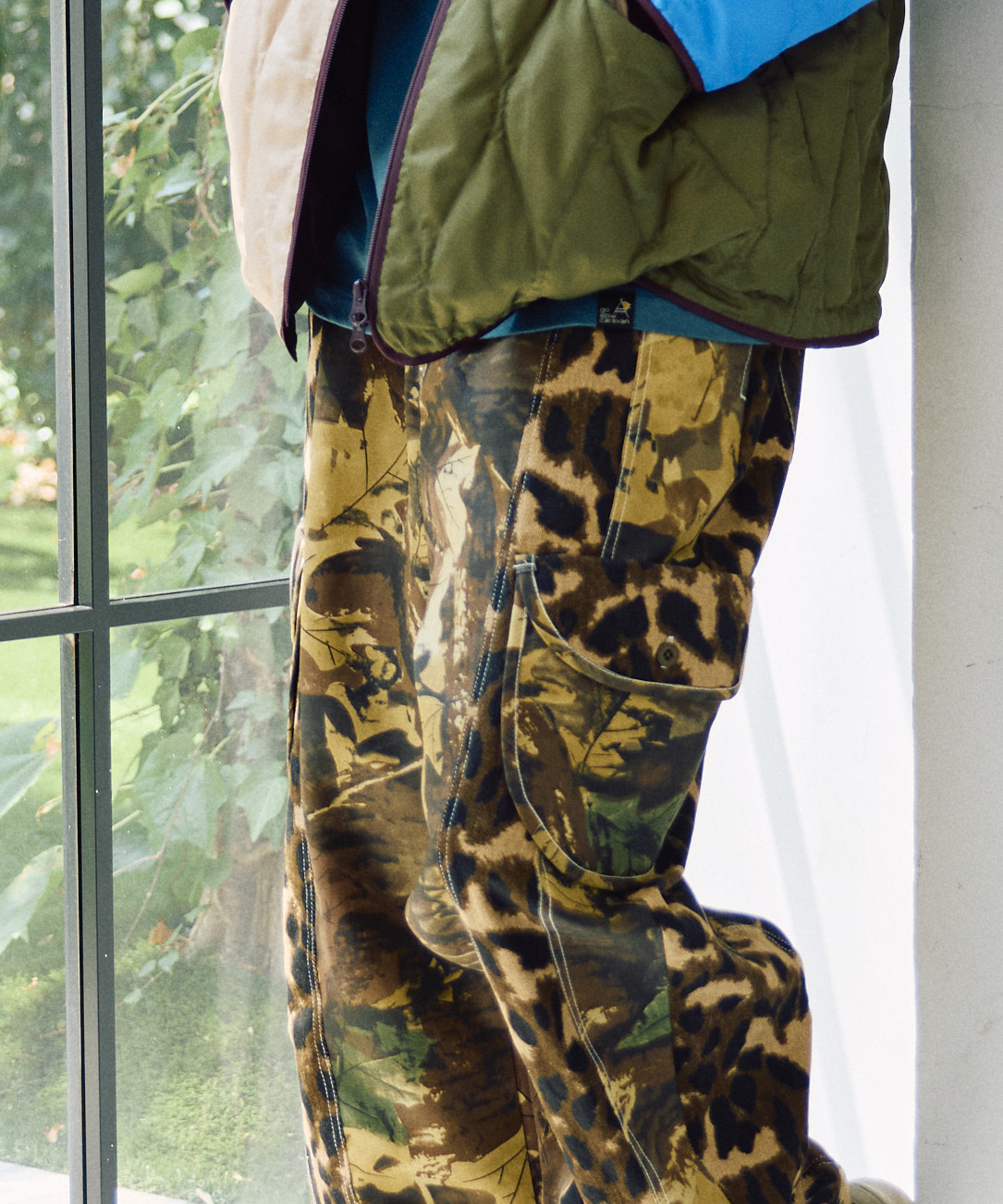 落ち着いたカラーのリアルツリー迷彩と同系色のレオパード柄を組み合わせたワイドカーゴパンツ。パイピング始末の丸みのあるカーゴポケットが独特なデザイン。股上を深く取ったテーパードシルエット。