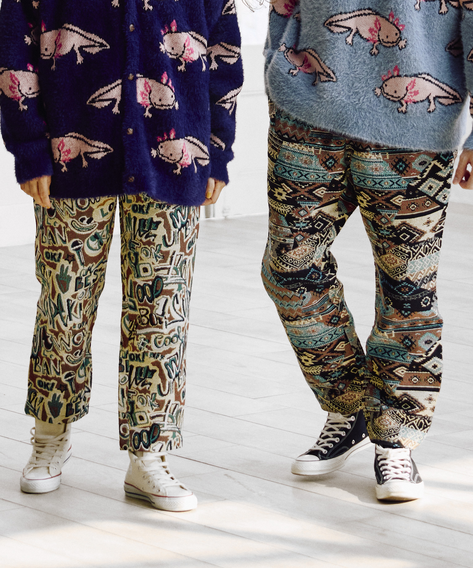 定番人気のハイクパンツから新作まで。迷彩と同系色のレオパード柄を組み合わせたワイドカーゴパンツ、ホネホネを総柄で刺繍したストレッチコーデュロイのアンクルパンツ、インパクトのあるゴブラン織りの総柄イージーパンツなど、新鮮味を感じるおすすめの”イチオシ”ボトムスが登場です♪
