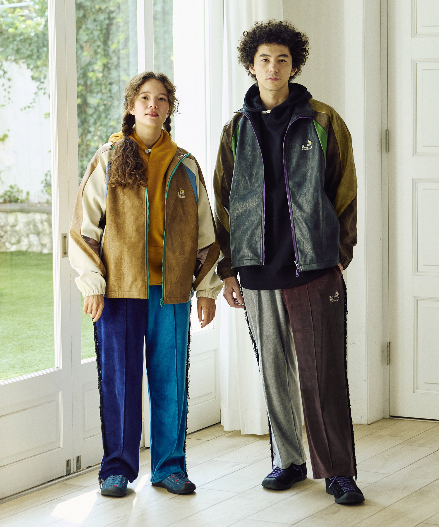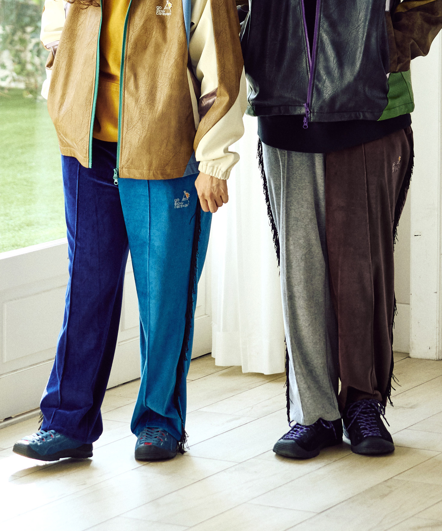 綿ベロアを左右でクレイジーに切り替えたトラックパンツ。両脇にはラインテープではなくフリンジを配し遊び心を加えました。