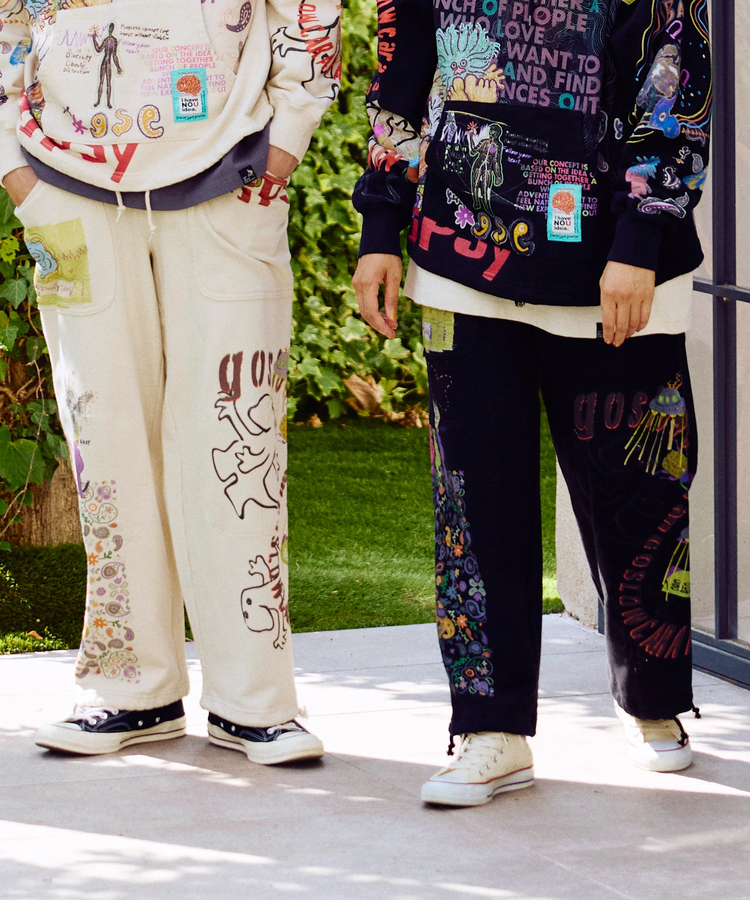しっかりとした生地感のストレッチコーデュロイに、キュートな「ほねほね」を総柄刺繍した存在感抜群のアンクルパンツ。腰回りはゆったりめで裾に向かってテーパードしたシルエットに仕上げ、動きやすさとおしゃれさを両立。
