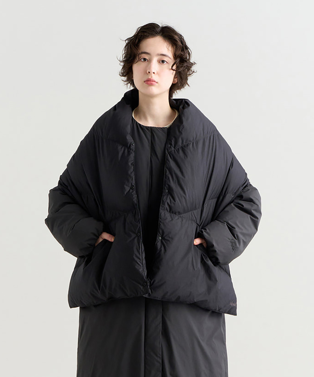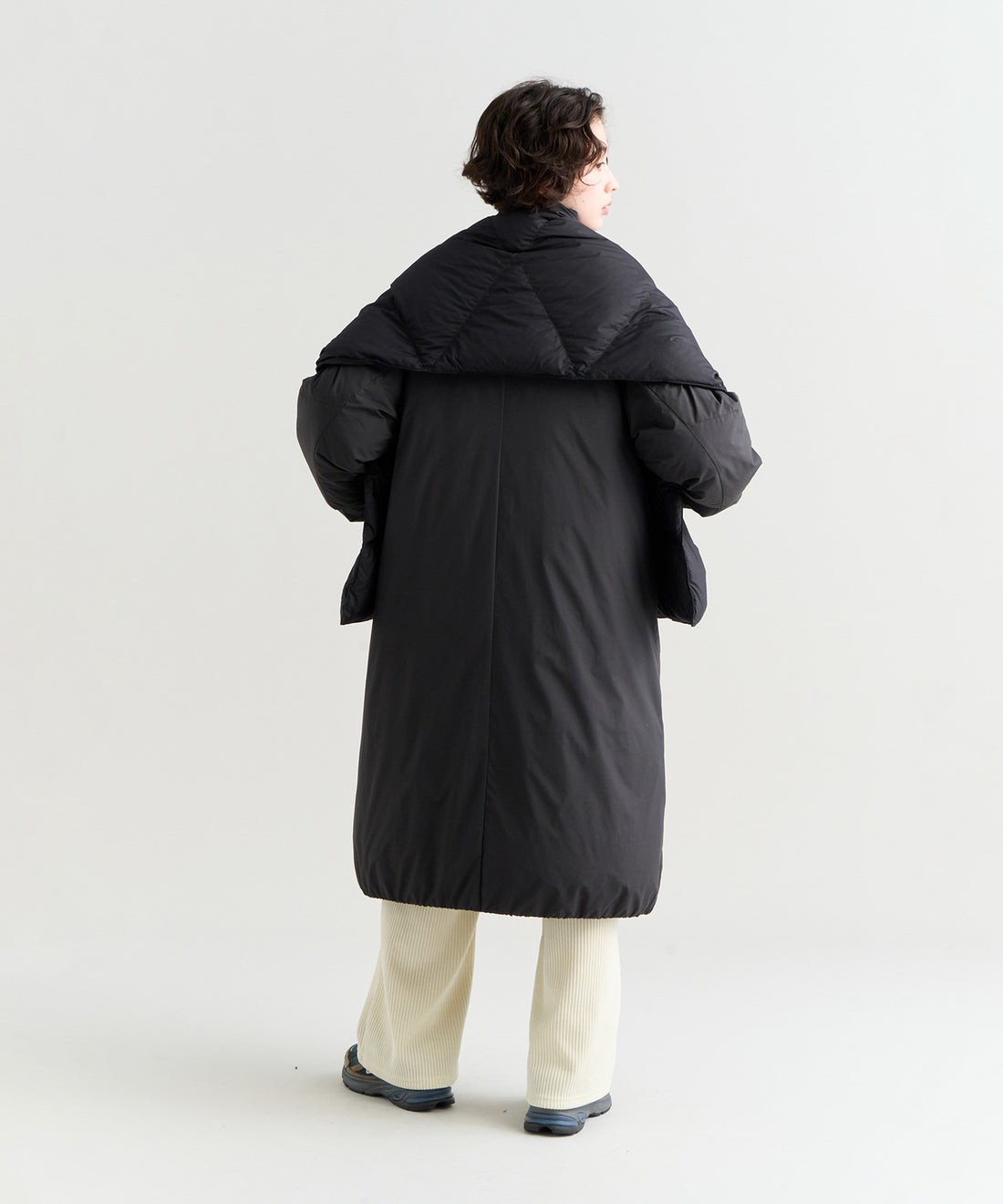 大判なシルエットのダウンポンチョマフラー。同素材やのNO COLLAR DOWN COAT / ノーカラーダウンコートとセットアップで着用可能。