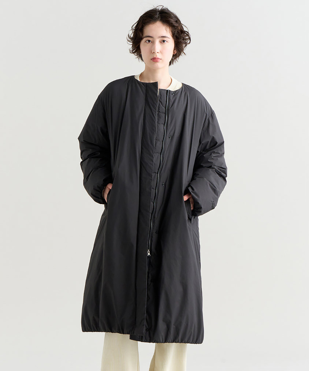 身幅にゆとりのある、リラックスシルエットのノーカラーダウンコート。襟を無くすことで、冬のファッションも軽やかに完成させることができます。インナーにフードや襟のついたウェアを着用してもゴワゴワすることなく、快適に着用することができます。