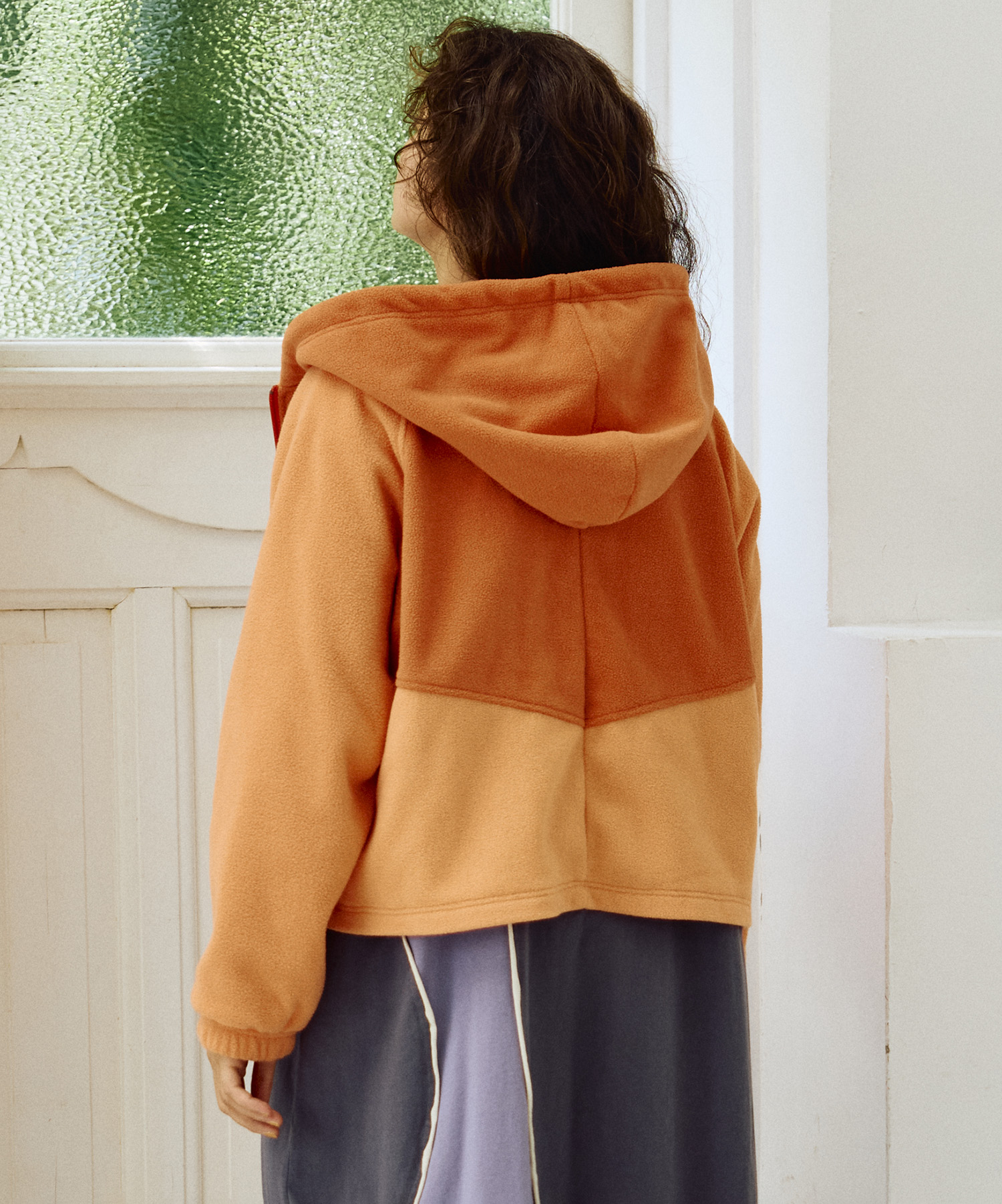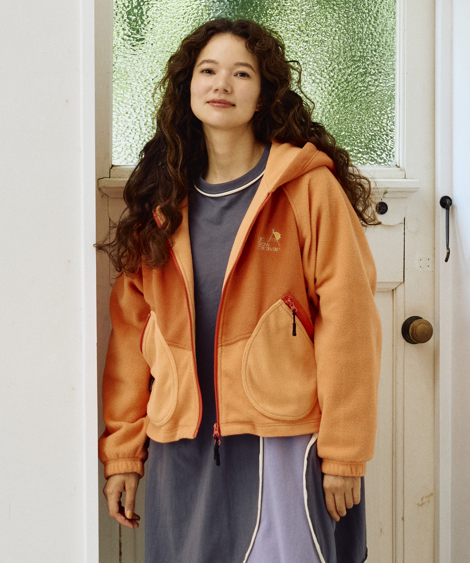 中肉のフリース素材のフロントジップ仕様のパーカージャケット。短めの丈でワイドパンツやスカートとのバランスが◎軽アウターとしても◎