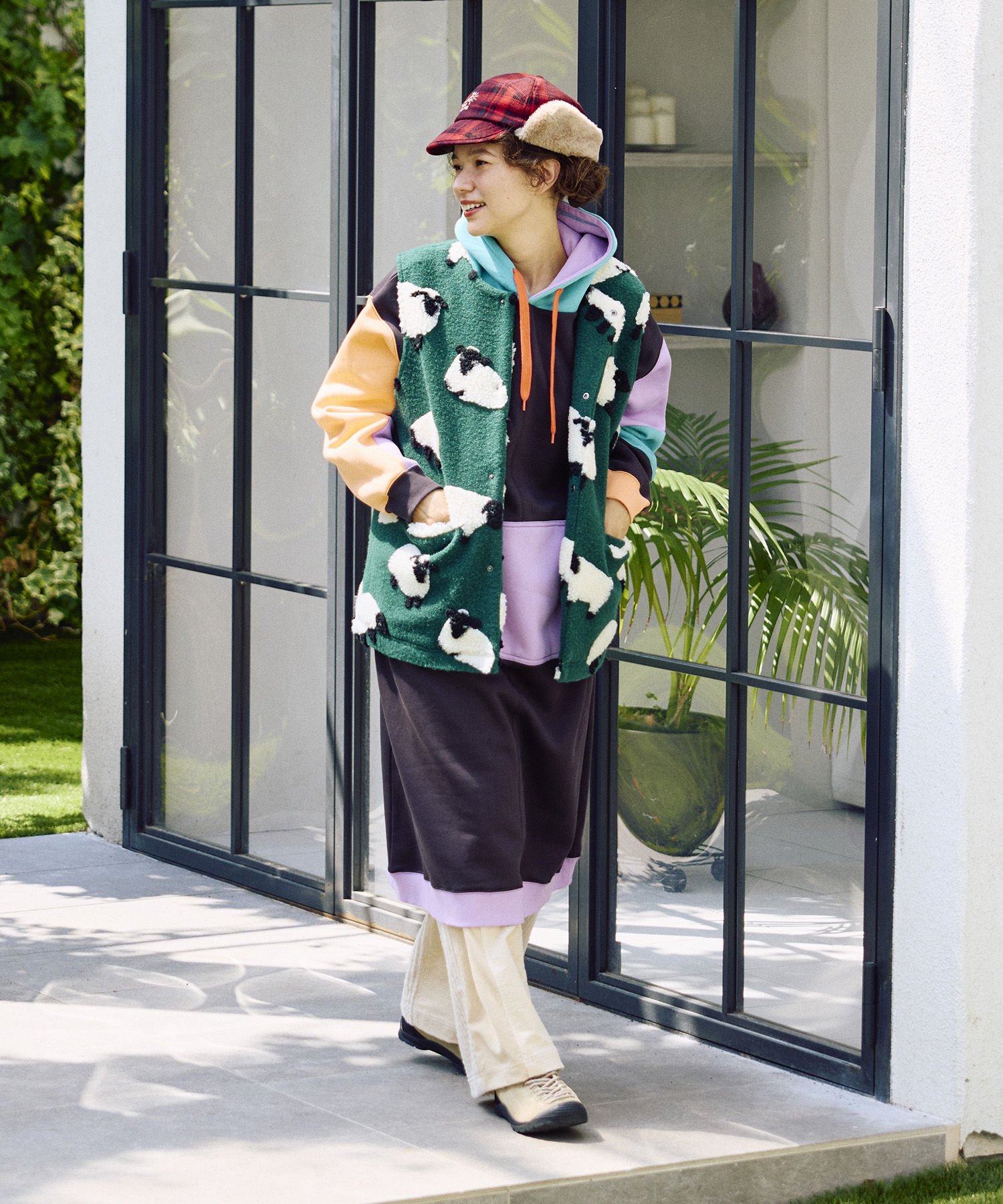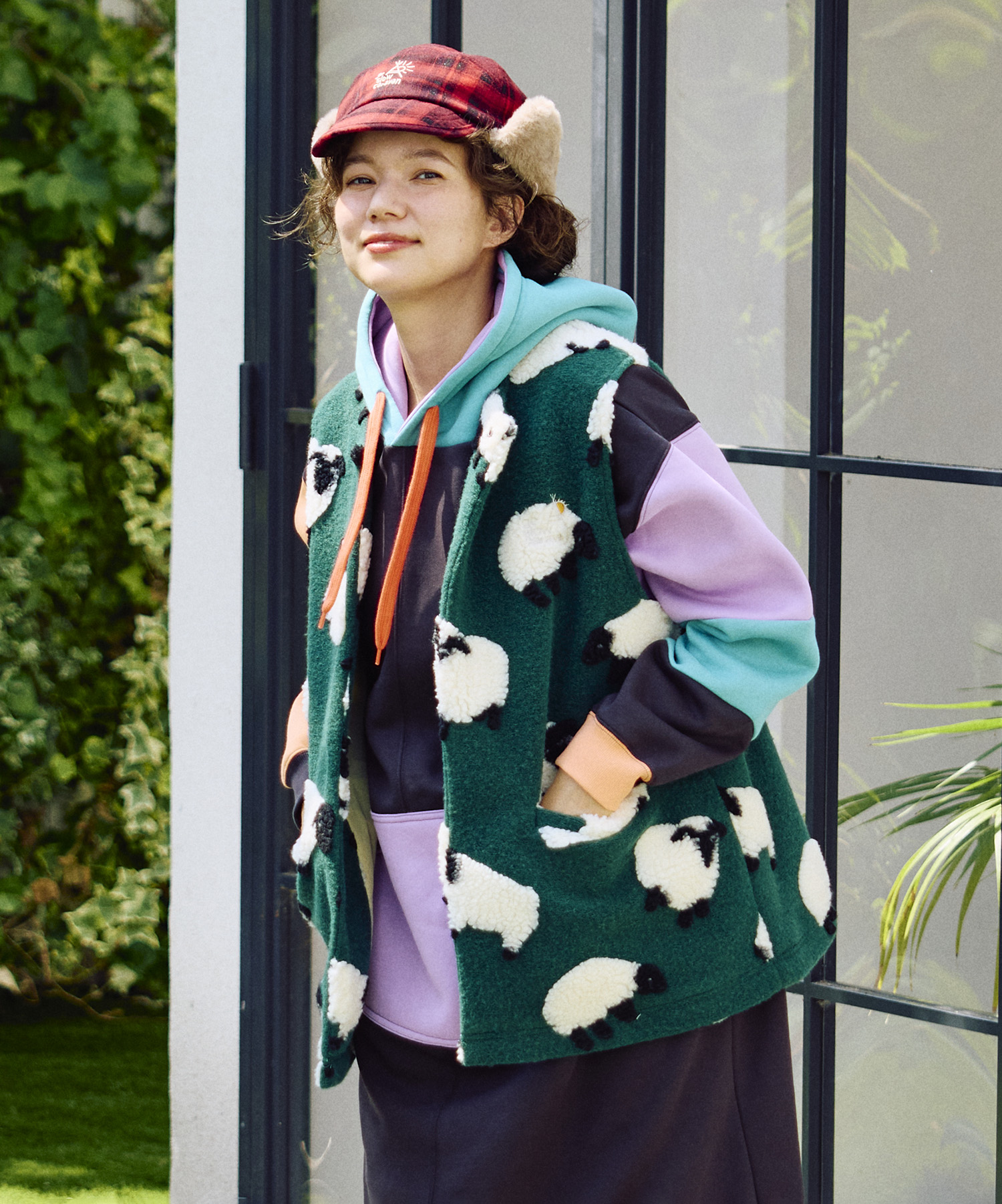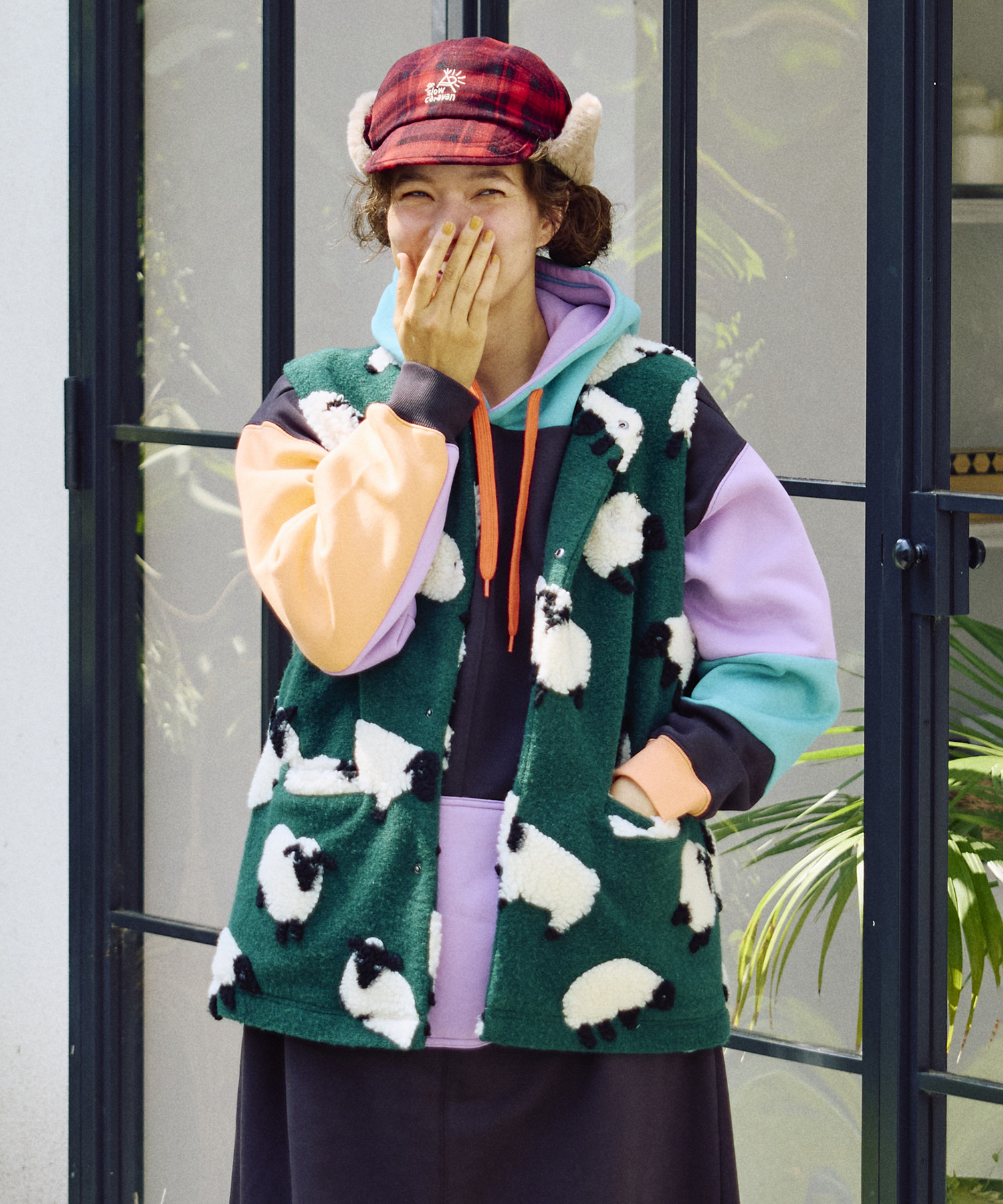 ゴースローキャラバンオリジナルのジャガードボアに、人気の【パンダ】&【ひつじ】柄が登場!やわらかな風合いと愛らしい柄が魅力のシリーズ☆レイヤードスタイルが楽しめるスナップボタン仕様のベスト!