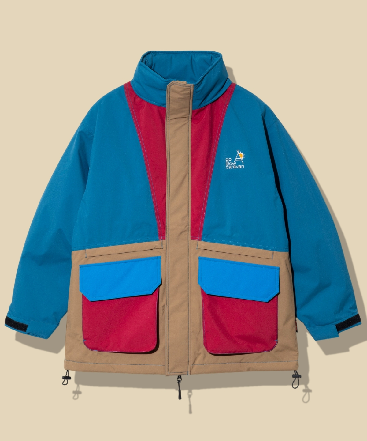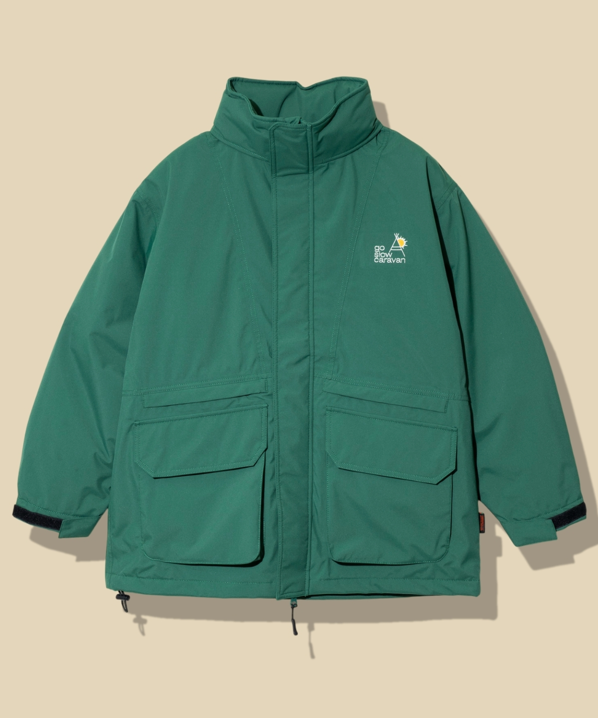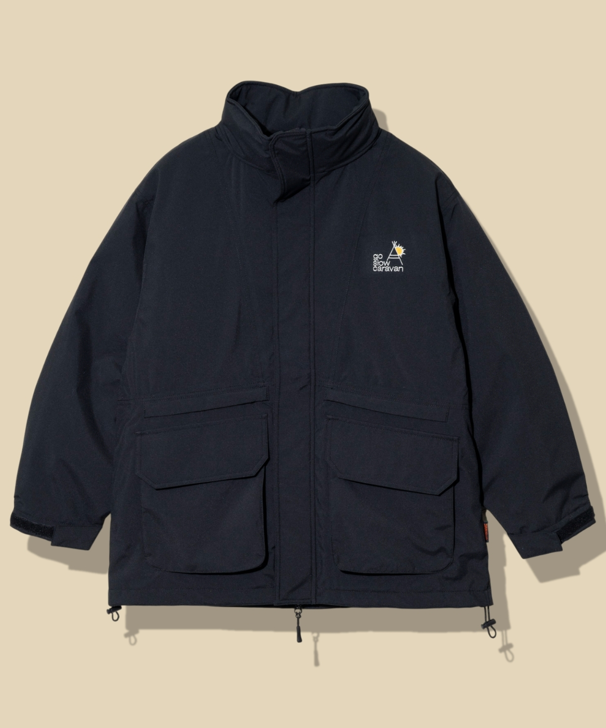 表地は2レイヤーのシェル、裏には高機能中綿のサーモライトを使用しキルティングした防水性、保温性に優れたアウター。衿の中に同素材のフードが収納されているので天候の急変にも対応。
