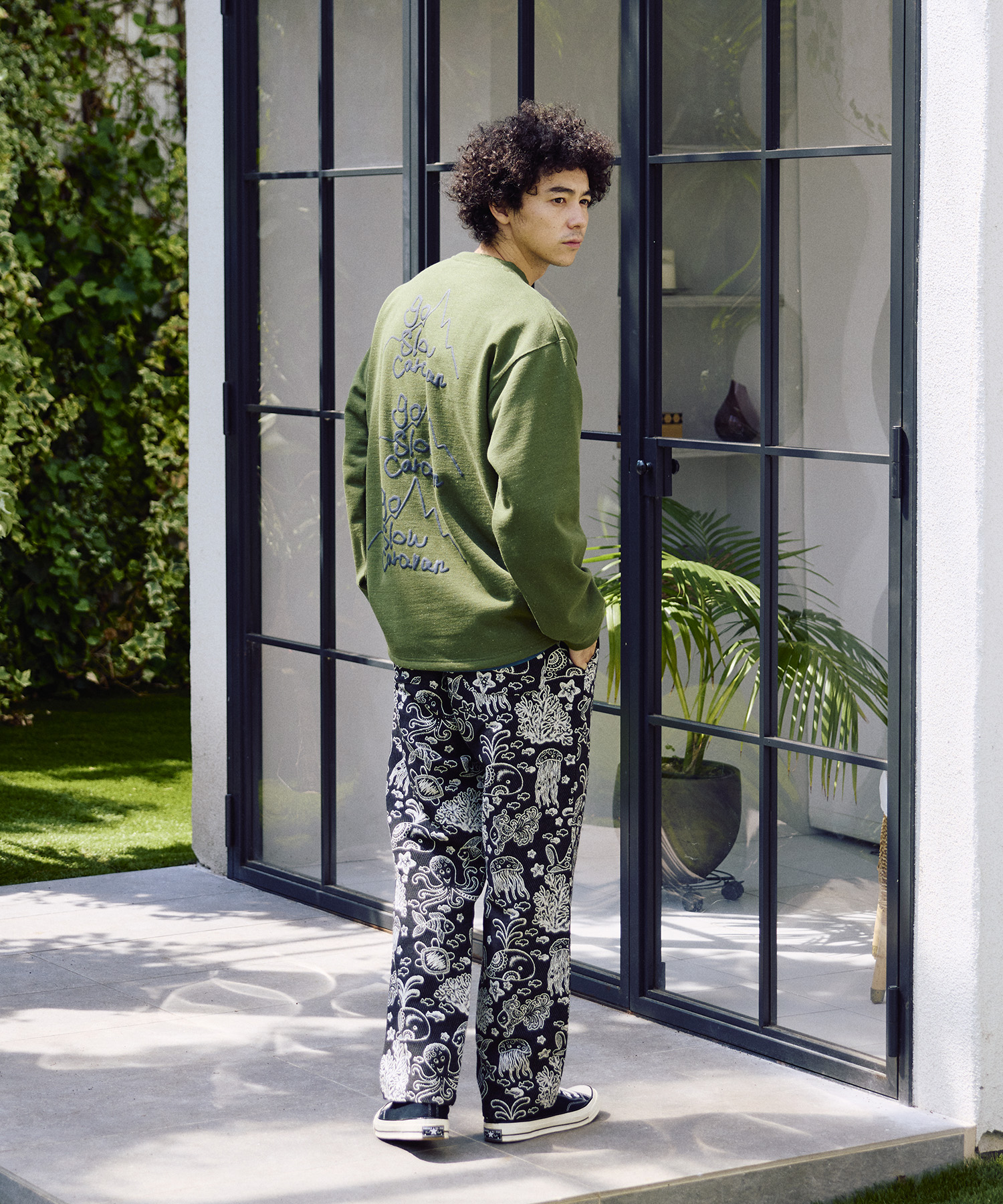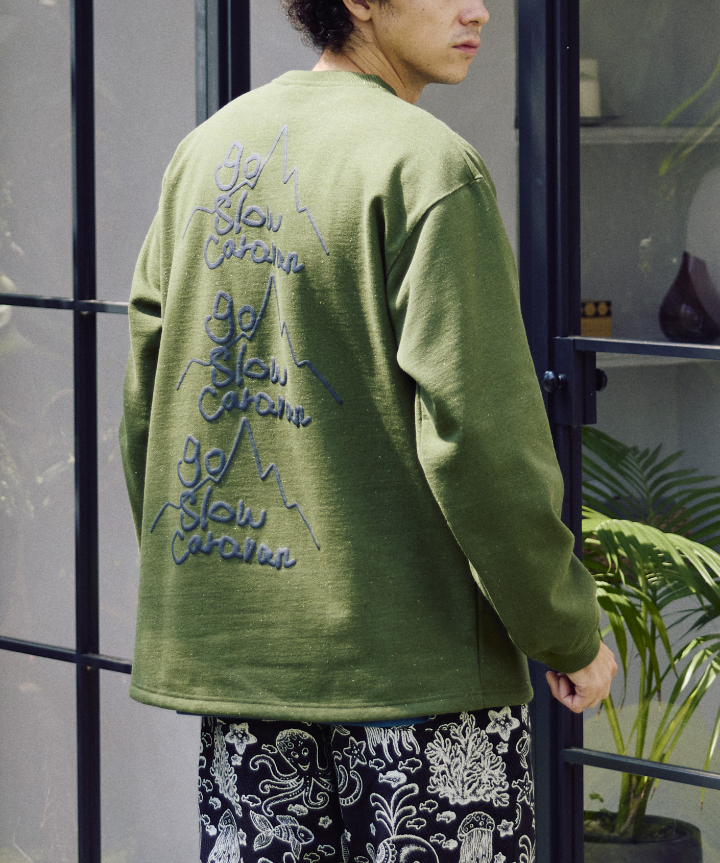 eco leadを使用した、しっかりとした厚みがありながら軽くて暖かい裏起毛素材のクルーネックスウェット☆裾は緩やかなラウンドカットで、ライトに着られる汎用性の高いシルエットに仕上げ。フロントには左胸に手描きタッチのロゴ刺繍、バックには存在感のある発泡プリントを配置。
