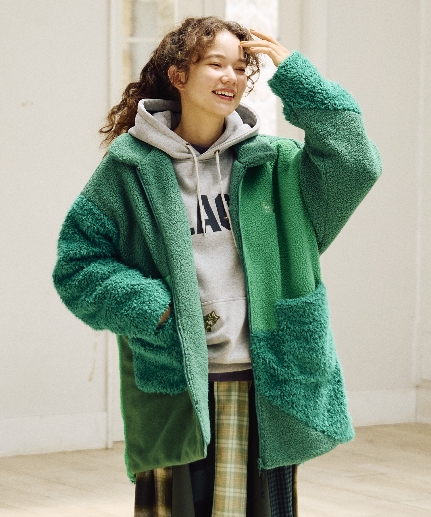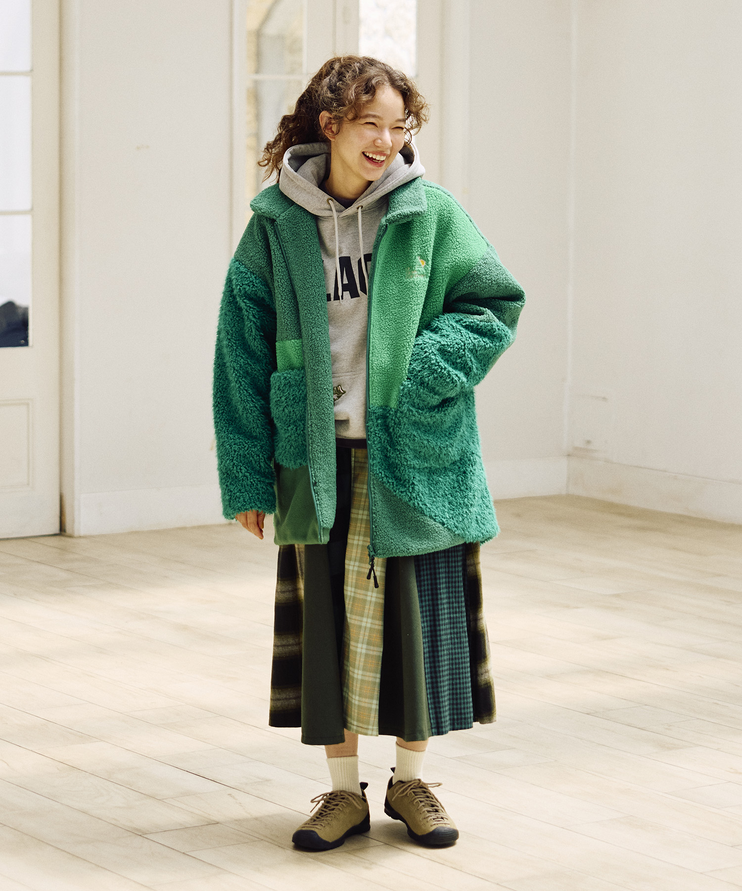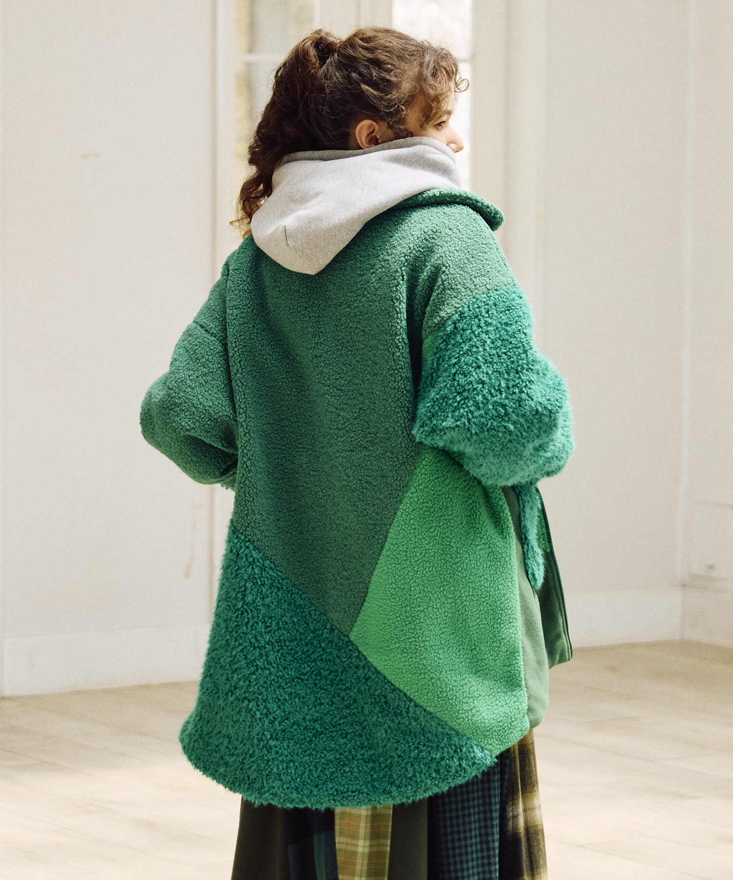 4種類のボアやフリース素材を組み合わせた、表情豊かなパッチワークシリーズ☆異素材の風合いがアクセントになり、シンプルなスタイリングにも旬のムードをプラスしてくれます。どちらのアイテムも前立てはダブルジップ仕様で、着こなしのアレンジがしやすいのも魅力です。