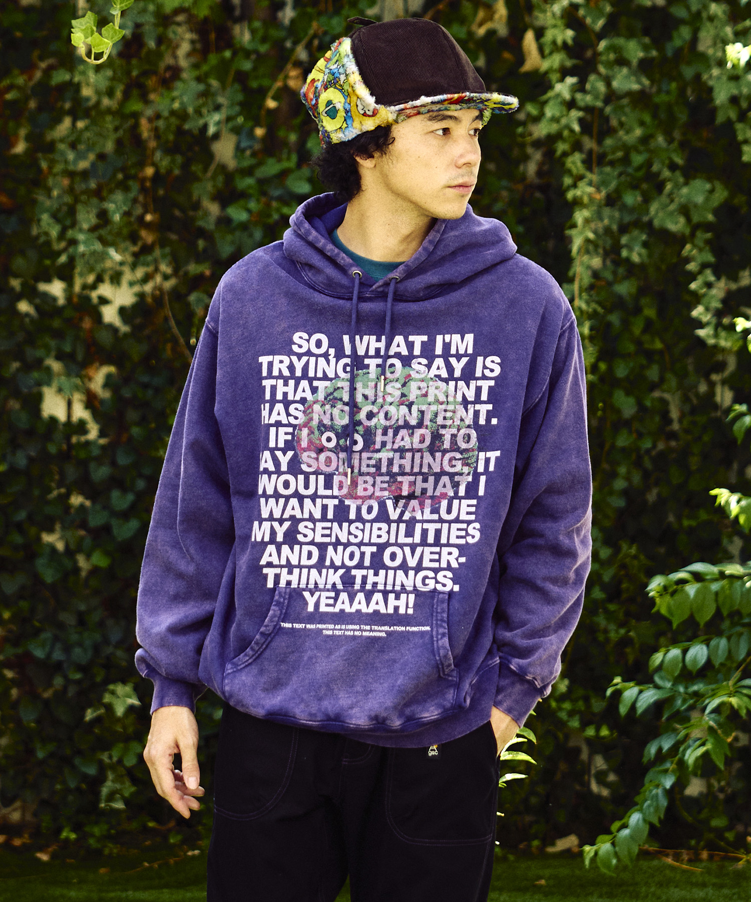 下から上へと自然に色が抜けていくグラデーションフェード加工を施し、古着のような風合いを表現したBOXシルエットのビッグスウェット。ボディカラーごとに異なるグラフィックとプリント手法を組み合わせ、“I HAVE NO IDEA” のメッセージを添えた、どこかユーモアを感じるデザイン。