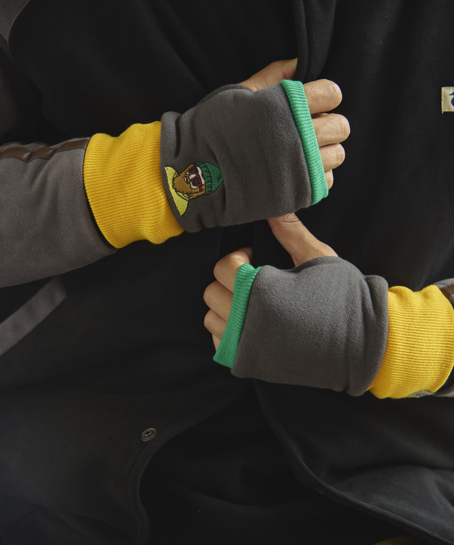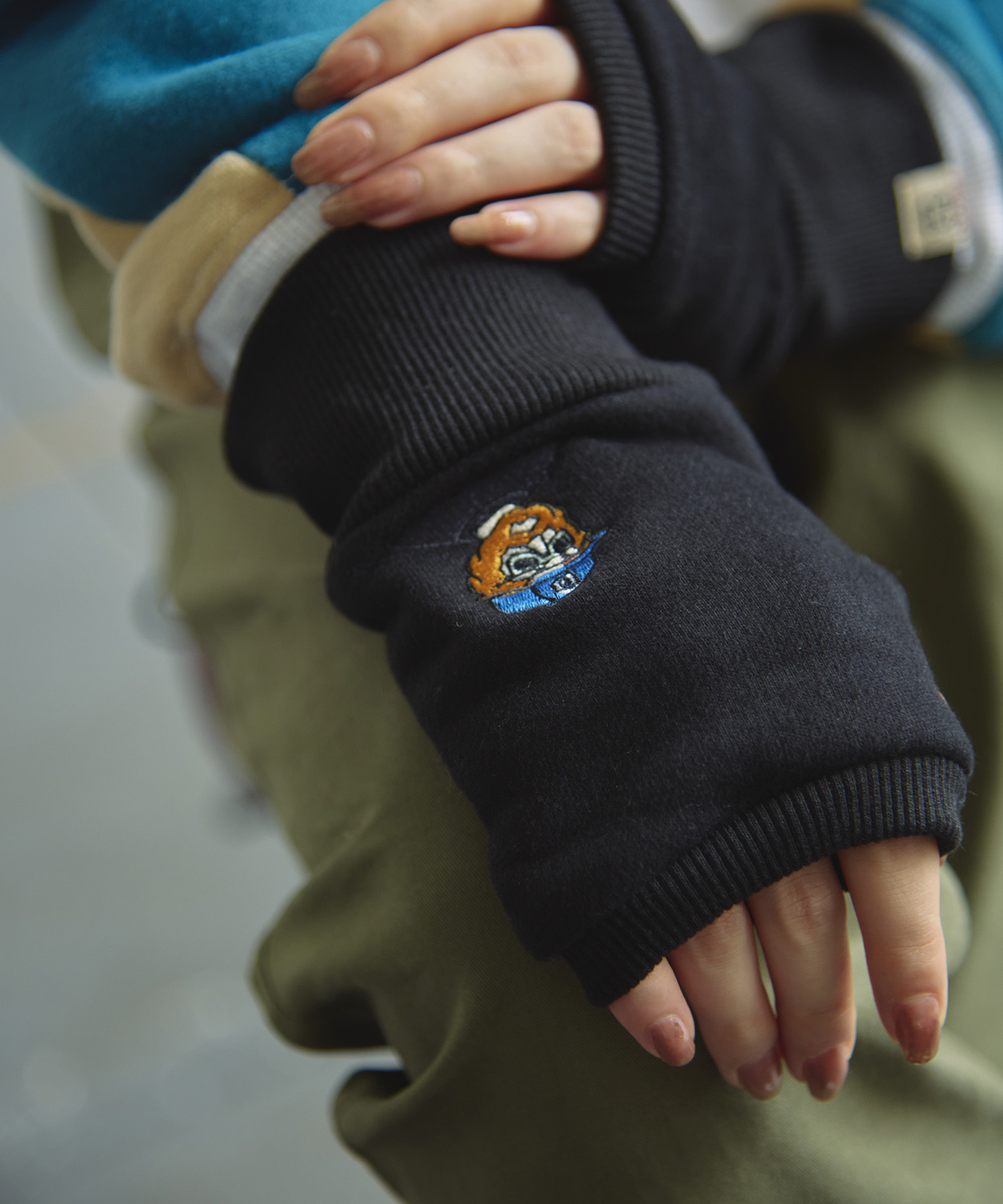 柔らかなスウェット素材を使用したハンドウォーマー。指先が出るデザインで、スマホ操作などの細かい作業もしやすい仕様です。さりげなく入った“OJISAN”のワンポイント刺繍がアクセントになり、ほっこりとした遊び心をプラス。