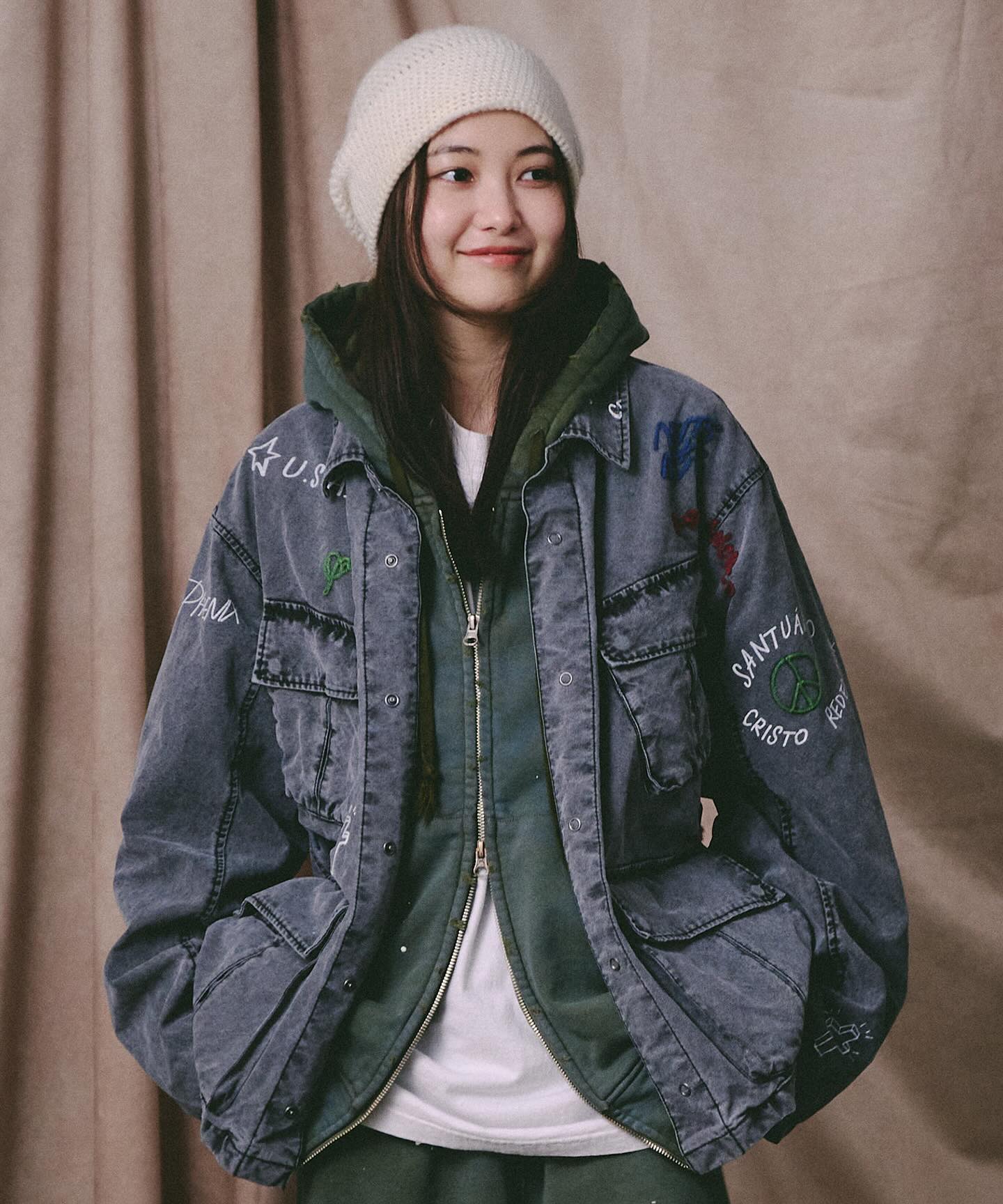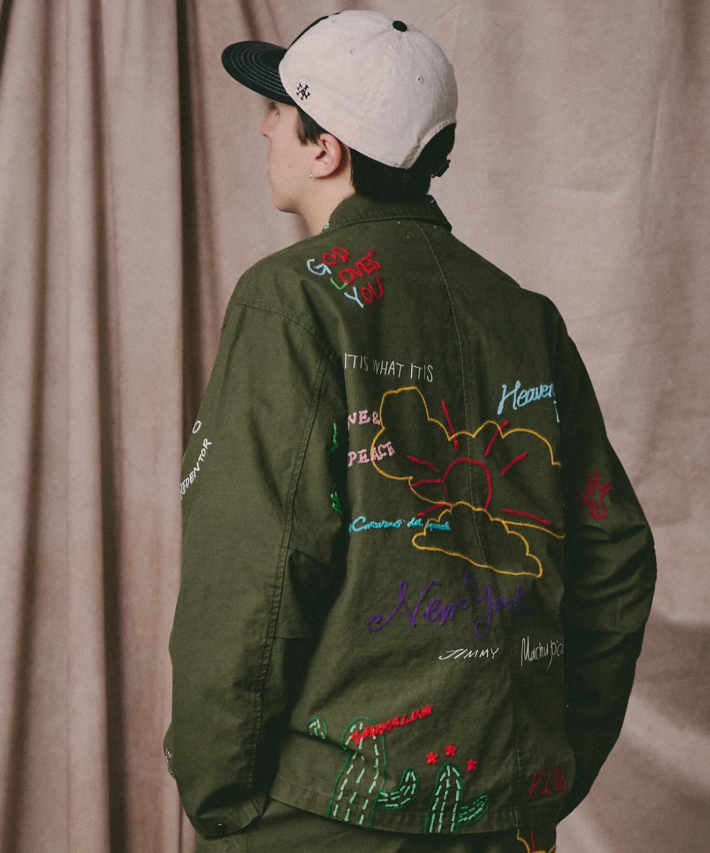 オリジナルのリメイク刺繍が特徴的なファティーグジャケット。バックサテンを使用した定番のファティーグジャケットに落とし込んでおり、加工感もヴィンテージの雰囲気が抜群。
