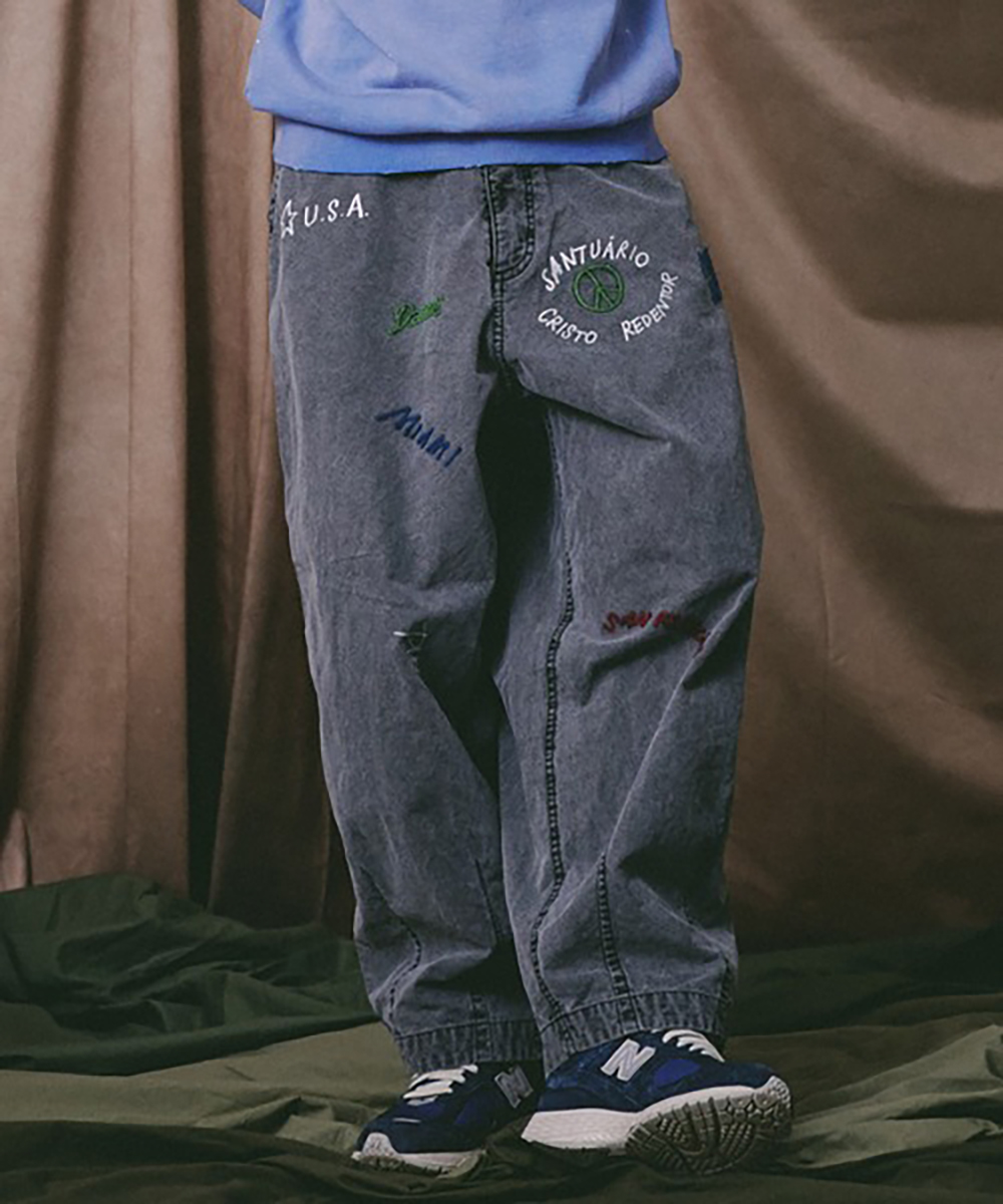 オリジナルのリメイク刺繍が特徴的なバズーカパンツ。バックサテンを使用した定番のバズーカパンツに落とし込んでおり、加工感もヴィンテージの雰囲気が抜群。