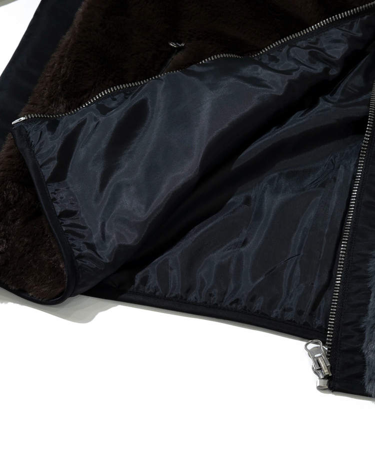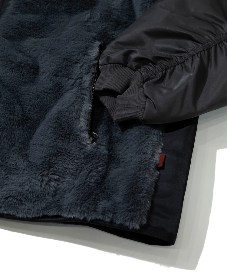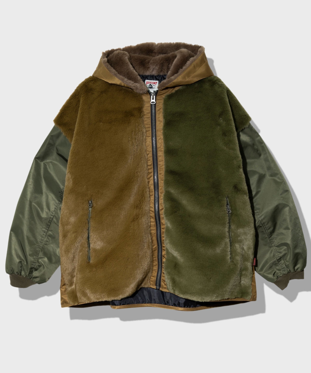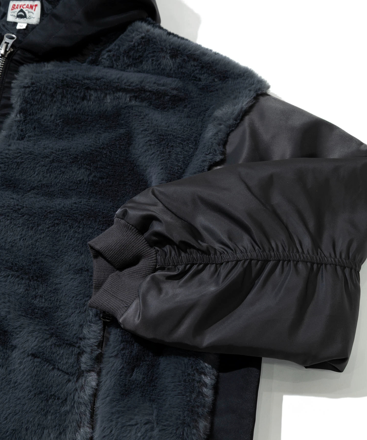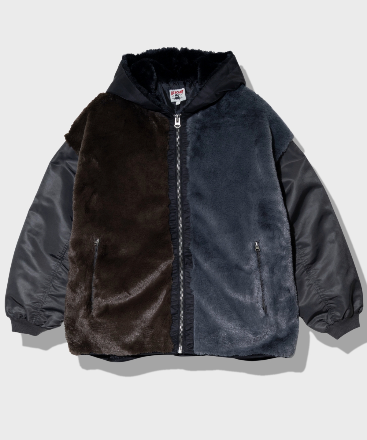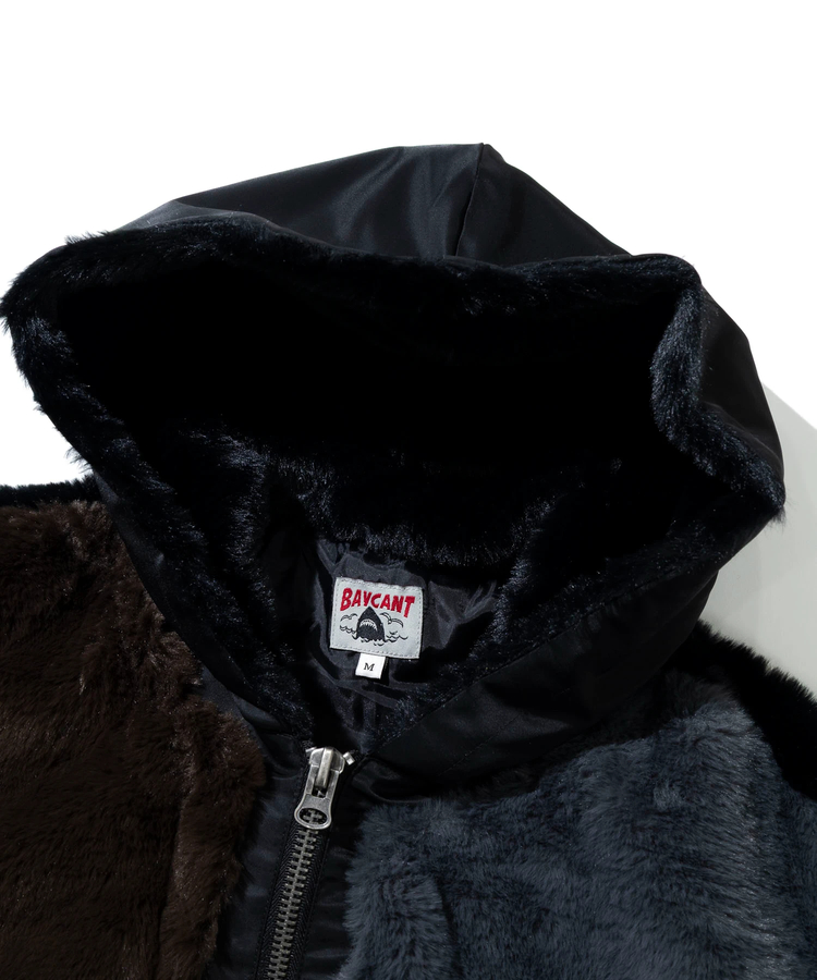 ボアフリース リバーシブルパーカーとSWITCHING SWEAT HOODIE&SWEAT PANTSが好評のBAYCANT/ベイカントから、ほどよいボリューム感と、抑えめながらしっかり効いたクレイジー切り替えが魅力のファーxナイロンツイル フードブルゾンが登場!