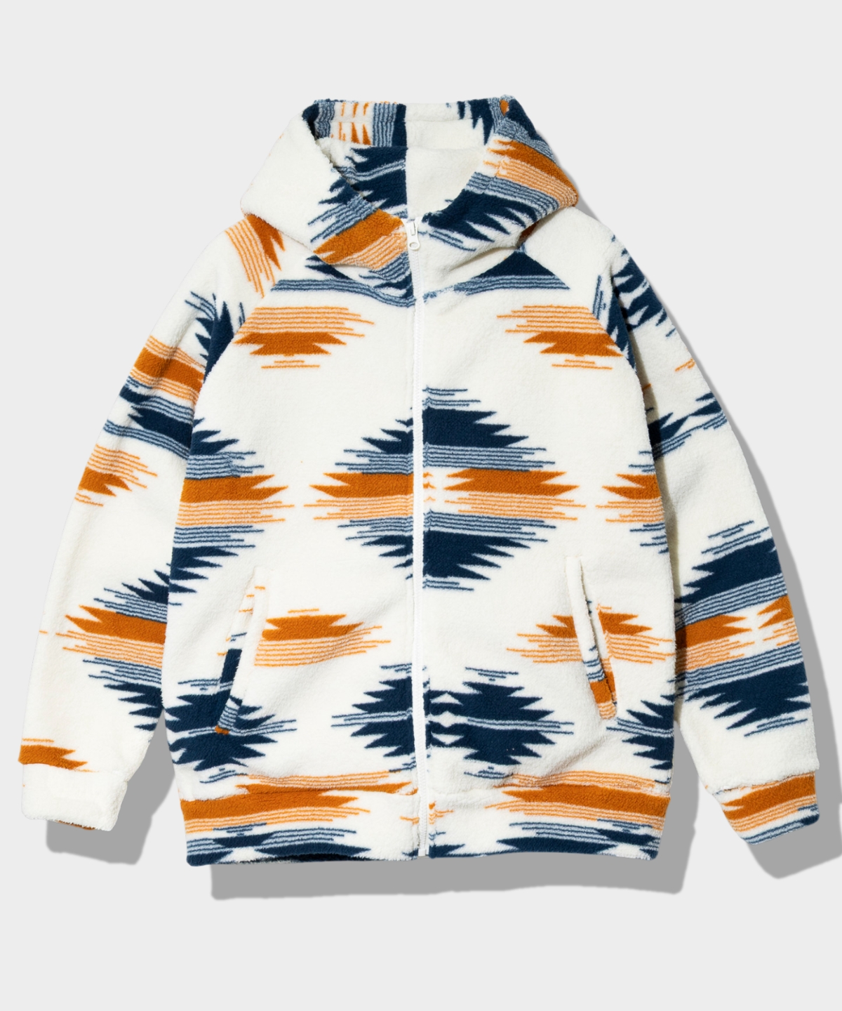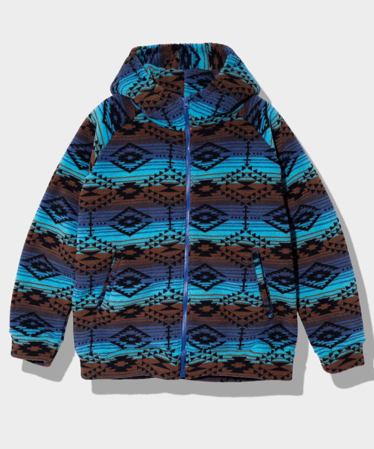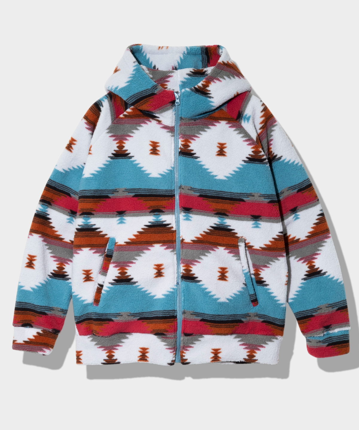 ネイティブ柄を全面にあしらった存在感のあるフリースパーカー。肌ざわりの柔らかなボアフリースを使用しており、軽さと暖かさを兼ね備えた快適な着心地が魅力。一枚で主役になるデザインで、冬のカジュアルスタイルを個性的に仕上げてくれるアイテムです。
