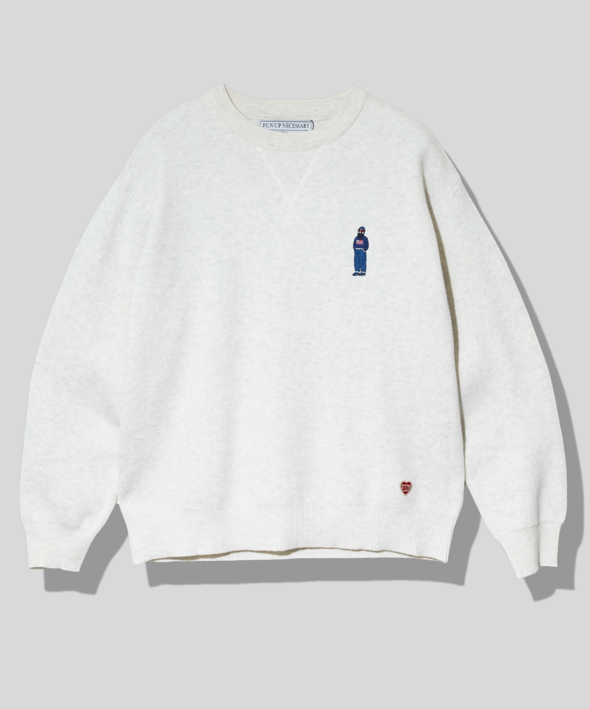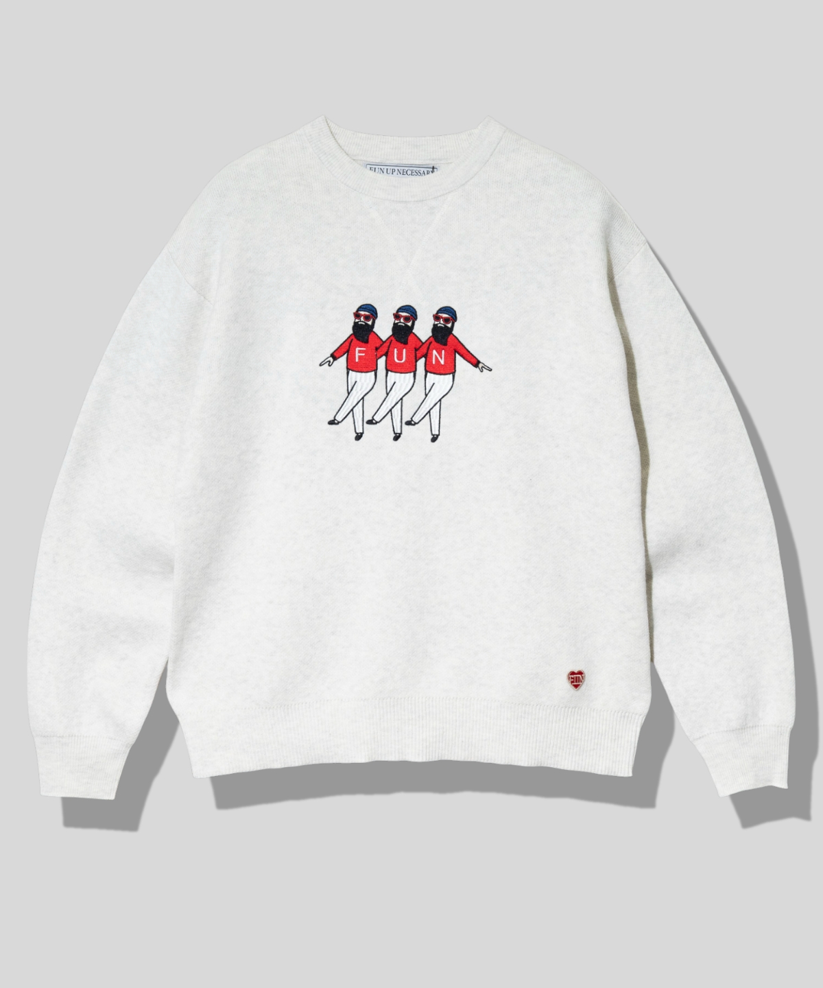 胸元に入った“トリオおじさん”が、落ち着いたワンポイントながらもしっかり存在感を発揮します。程よい肉感のニット地で、カジュアルにもキレイめにも合わせやすい万能アイテム。シンプルな中に遊び心を添える、大人のためのデイリーウェアです。