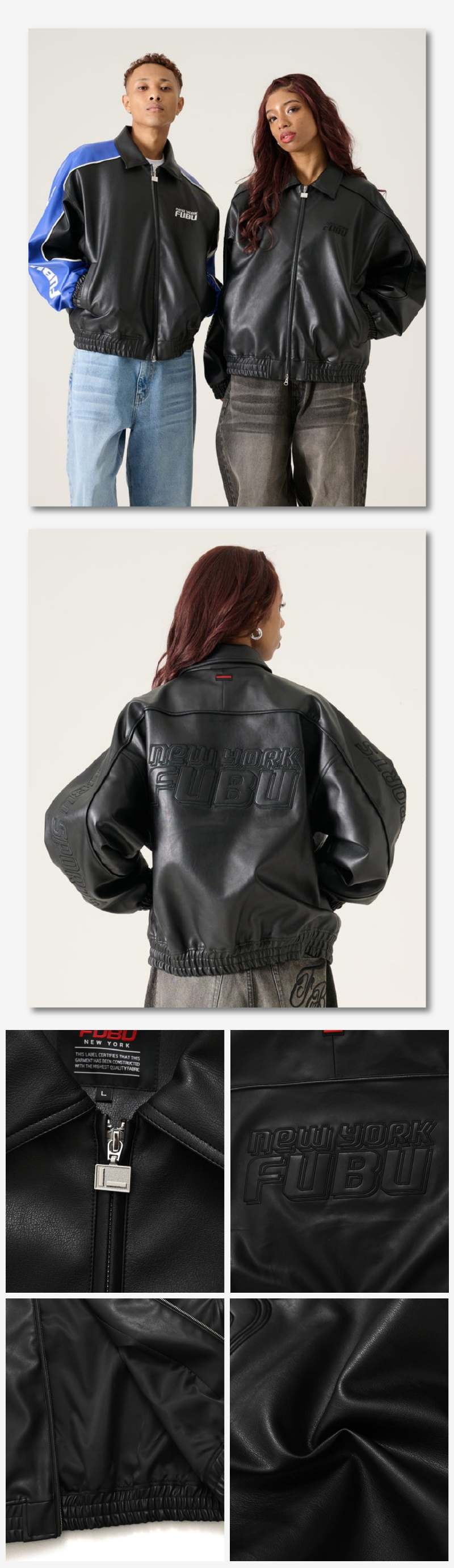 袖に配した大胆なロゴとカラーブロックが強い存在感を放ちます。本革のような光沢感とシボ感を再現した高品質なフェイクレザーを使用し、重厚な見た目ながら軽やかな着心地を実現。汚れや水に強く、イージーケアでデイリーに取り入れやすい一着です。