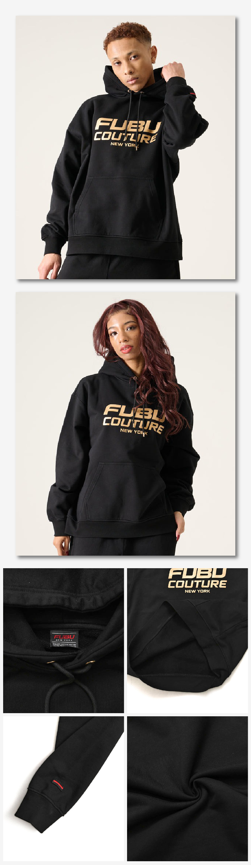 身幅と肩幅にゆとりを持たせたルーズなバランスで、リラックスした着こなしを楽しめます。フロントには「FUBU COUTURE NEW YORK」のロゴを大胆に配置し、ゴールドの光沢プリントがカジュアルな中にラグジュアリーなアクセントをプラスします。