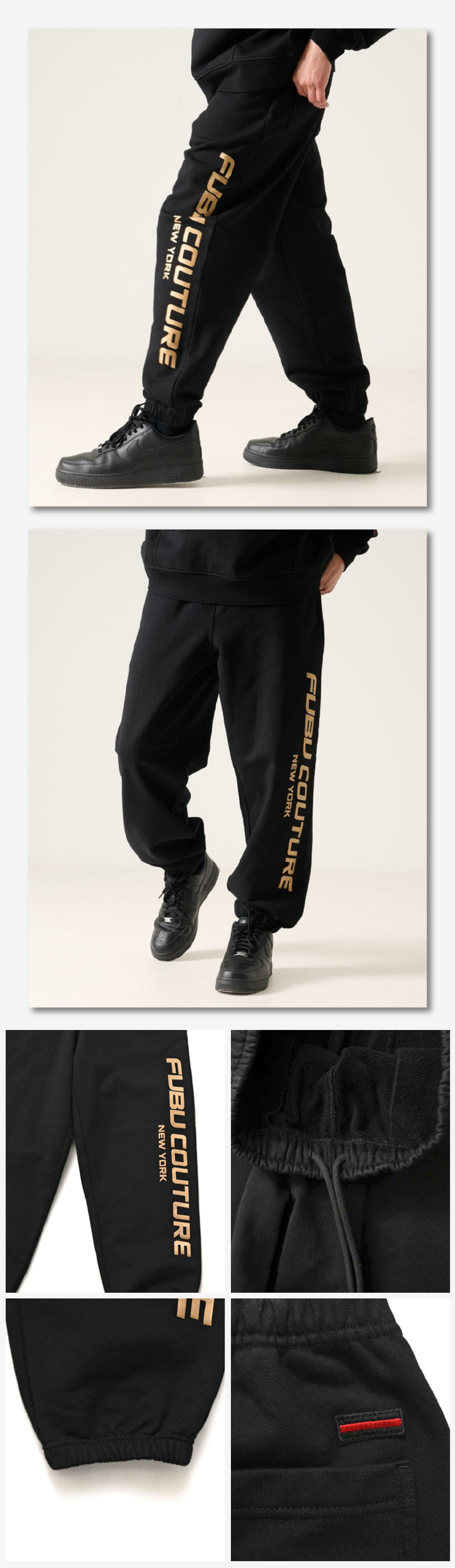 腰回りと太ももに程よいゆとりを持たせ、快適な穿き心地を実現しています。左足サイドに配した「FUBU COUTURE NEW YORK」のゴールドロゴが存在感を放ち、デイリーからアクティブシーンまで幅広く活躍する一本です。